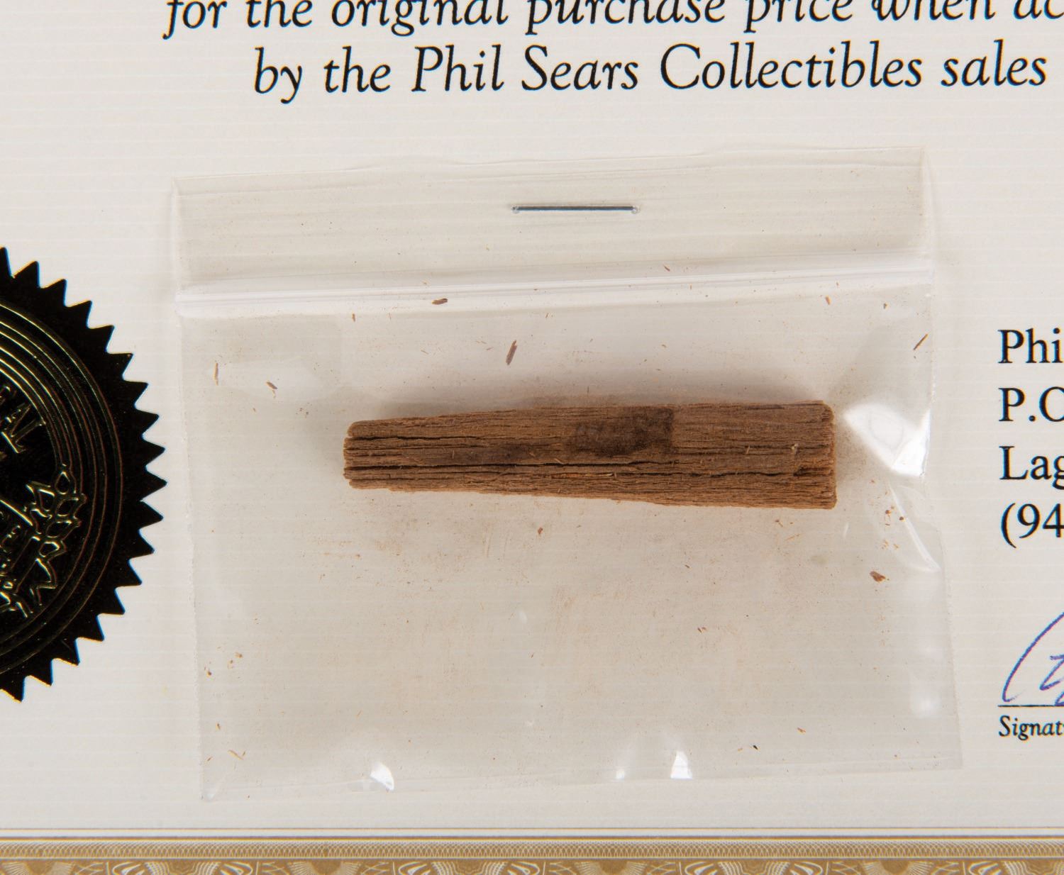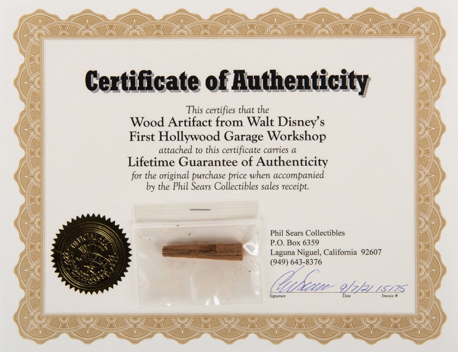 (Disney, 1923) A wood section from Walt Disney's garage animation studio in Los Angeles. The garage workshop is often credited as Walt's first animation studio, and this wood was salvaged during a more recent project to save and preserve the garage. It measures 1.5" long and is in good used condition. It comes with a COA from Disney Historian Phil Sears.