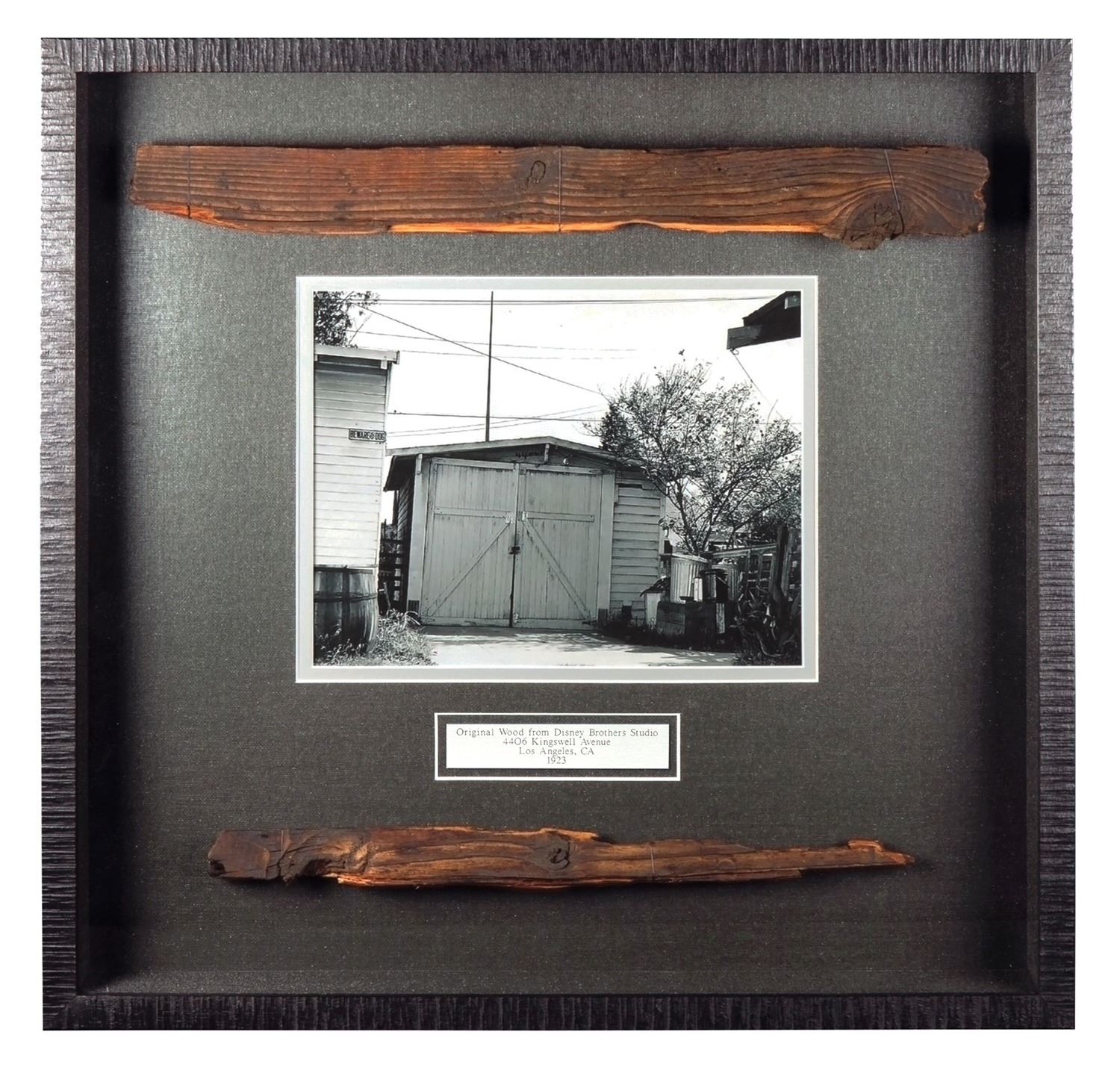 (Disney, 1923) A pair of wood sections from Walt Disney's garage animation studio in Los Angeles. In 1923, following the bankruptcy of the Kansas City, Missouri Laugh-O-Gram film studio, Walt left for Los Angeles where he stayed with his uncle Robert Disney. In addition to his $5 a week rent, Robert let Walt pay an additional dollar a week to use his barn as an animation workshop. It was in this barn that Walt worked on an animated reel of cartoon jokes which he tried to sell to the Pantages Theater Company. Walt constructed an animation stand within the barn, which, according to Walt, would later be used to film the Mickey Mouse cartoon Steamboat Willie. Walt personally donated the desk from this garage to the Los Angeles Natural History Museum in 1938. The garage workshop is often credited as Walt's first animation studio and, due to its historical significance, was lovingly preserved and moved in 1982 from the 4406 Kingswell Avenue address to the Garden Grove Historical Society. It has remained on display there for nearly 40 years, just a few miles from Disneyland. This wood was salvaged by Arthur Adler, who helmed the project to save the garage. The wood sections measure 19" and 23" long and are in fair condition, with moderate wear from their age. As it is approximately 100 years old, the wood is somewhat brittle. The wood sections come from the collection of esteemed Disney historian and Walt Disney autograph expert, Phil Sears, who was given the wood directly from Adler. A copy of Adler's book, "Walt Disney's Garage of Dreams," is included with the wood. In the book, Adler mentions giving the wood to Sears. Artifacts from this period of Walt's life are exceptionally scarce.