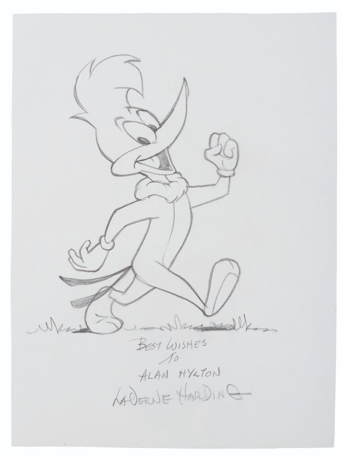 (Harding, 1970s-80s) A signed drawing of Woody Woodpecker by animator Laverne Harding. Harding is one of the few women to win the Windsor McCay Award for Lifetime Achievement and is known for her work at the Walter Lantz Studio. With an image size of 8" x 8.5" on 8.5" x 11.75" paper, the drawing accomplished in graphite is in very good condition with faint smudges and light wear from age.