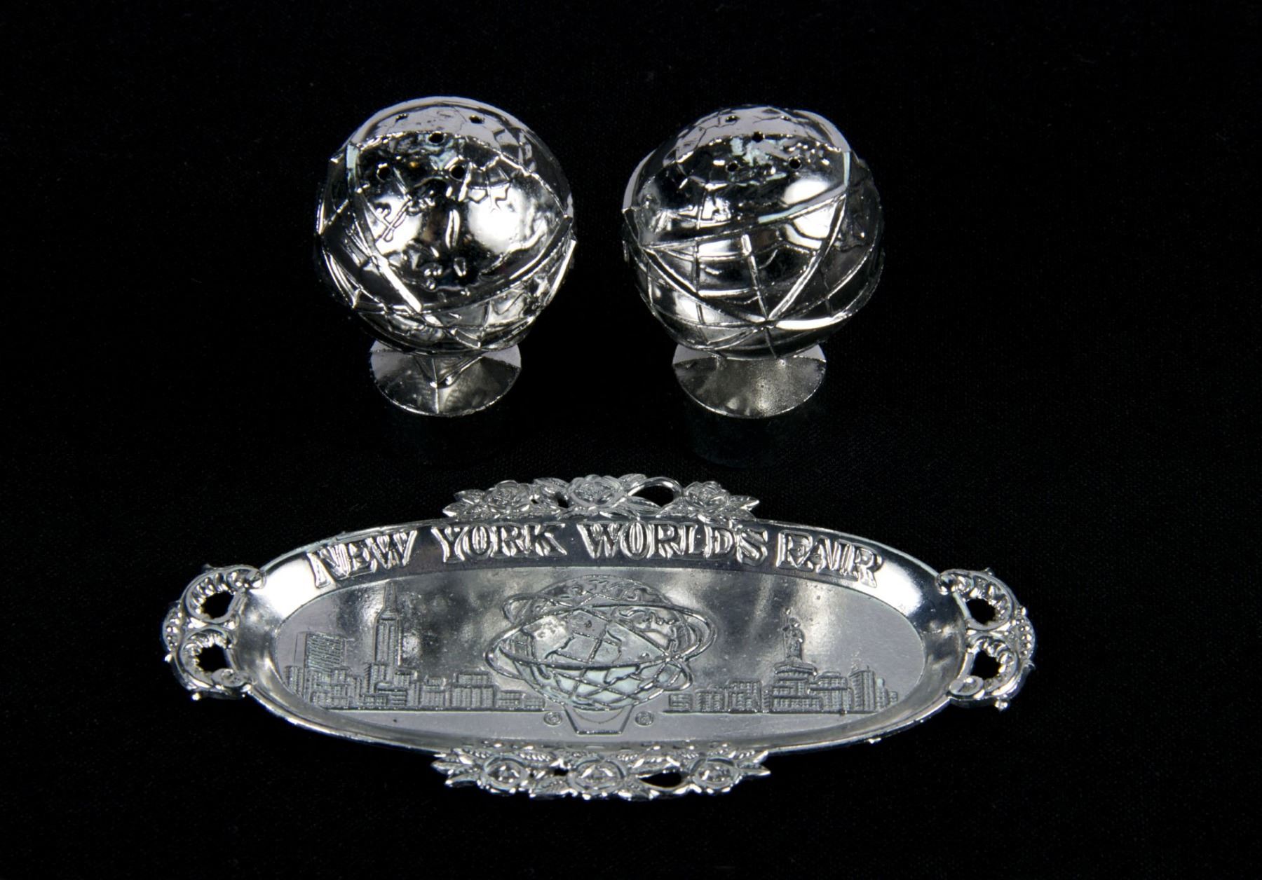 (World's Fair, 1964) A metal salt and pepper shaker set with matching tray from the 1964-65 New York World's Fair. The shakers are modeled after the Fair's symbol, the Unisphere, and the tray features imagery of the Fair with the Fair's name and years listed. Both shakers measure approximately 2" tall and the tray measures 2"x4". The condition is very good with little wear.
