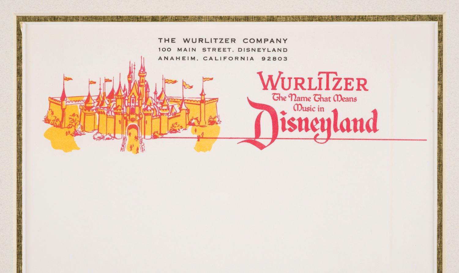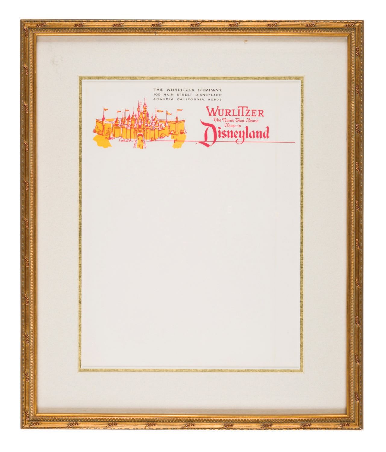 (Disneyland, 1955-68) A piece of stationery carrying the Wurlitzer and Disneyland letterhead. Stationary of this style was utilized by the staff of the Disneyland Wurlitzer Music Hall during its operation on Main Street from 1955-1968. Measuring approximately 8.5"x11", the stationary has been matted within a 15.25"x12.25" frame and is in fine as-new condition.