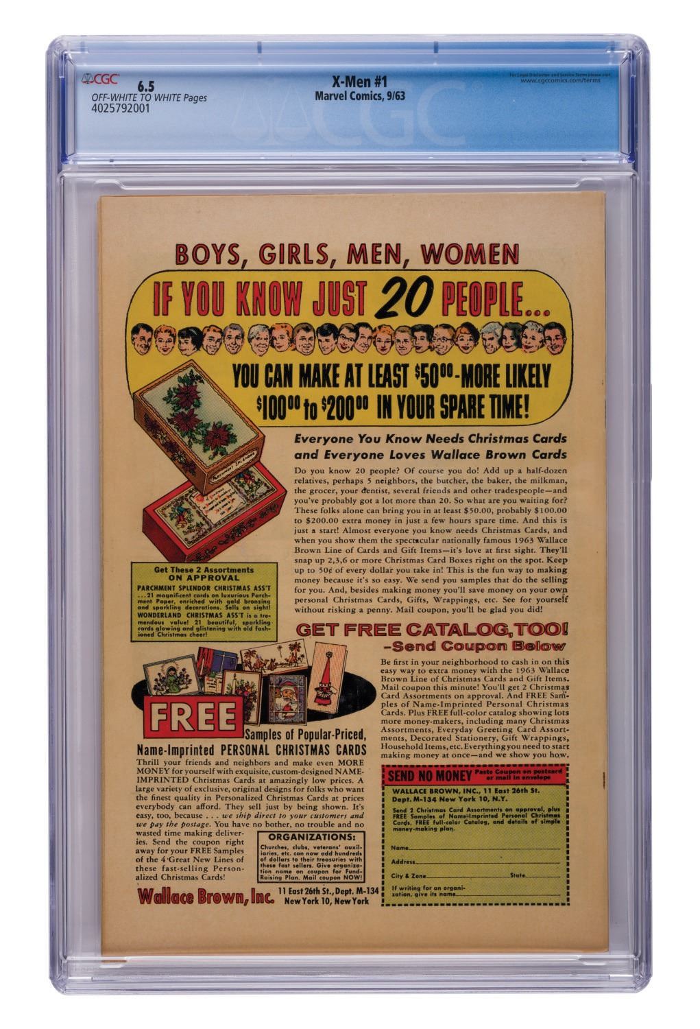 (Marvel, 1963) An extremely rare copy of X-Men #1. A key book in the evolution of the Marvel universe, X-men # 1 introduces us to the X-men (Angel, Beast, Cyclops, Iceman, and Marvel Girl), Professor X and Magneto, all presented by the Marvel "A-Team" of Stan "The Man" Lee and Jack "King" Kirby. The book is currently ranked in the #8 position on Overstreet's list of Top 50 Silver Age Comics. The book has been CGC authenticated and graded at a 6.5.
