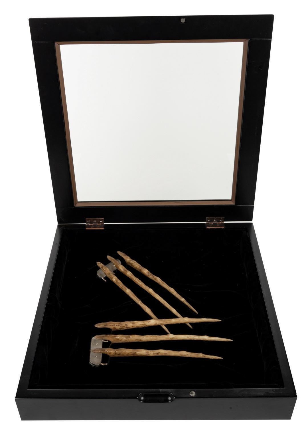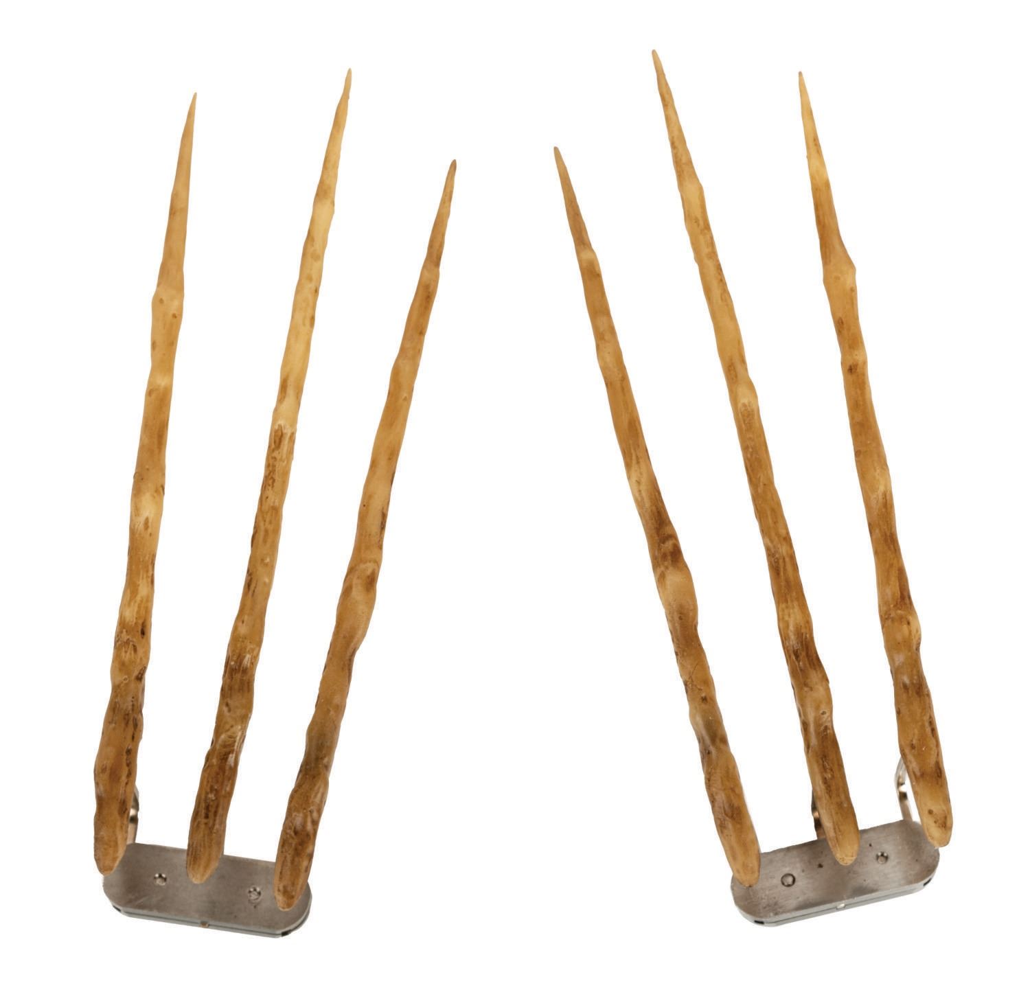 (20th Century-Fox, 2009) A pair of original prop Wolverine bone claws created for X-Men Origins: Wolverine. The props are constructed of cast resin and expertly studio finished to appear as human bone. These were highly visible on-screen when Logan (portrayed by actor Hugh Jackman) confronts Sabretooth (portrayed by Tyler Mane). Measuring 9" long, 3" wide and 2" deep, the props are in very good set-used condition, exhibiting scratches to metallic parts and some wear from production.