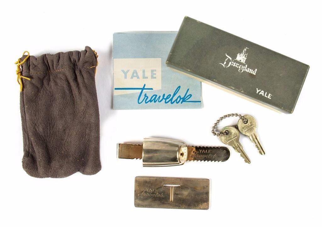 (Disneyland, c.1955) An extremely rare early Disneyland souvenir from the Yale Lock Shop on Main Street. This Yale Travelock comes in its original box and travel pouch. The Travelock is a 3-piece personal lock and comes with its two original keys. This lock also comes with its original instructional sheet from Yale. This item measures 5"x2" and 1.5" tall in its original box, and is in very good condition with little wear.