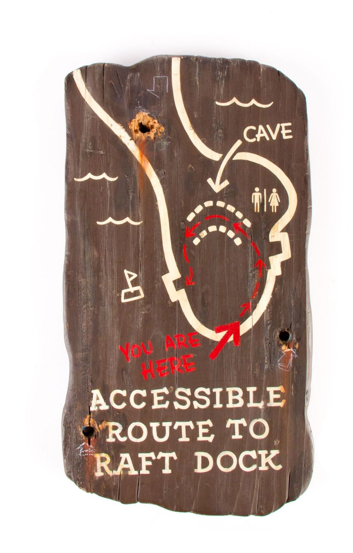 (Disneyland, c. 1980s) A very rare sign from "Tom Sawyer Island" at Disneyland. The wooden sign shows a map of the area with a red "You Are Here" arrow directing park guests to the "accessible route to raft docks". The sign measures 17"x9" and 1" thick. The sign is in good condition with a few mounting holes in the wood and some minor wear throughout from its original park use.