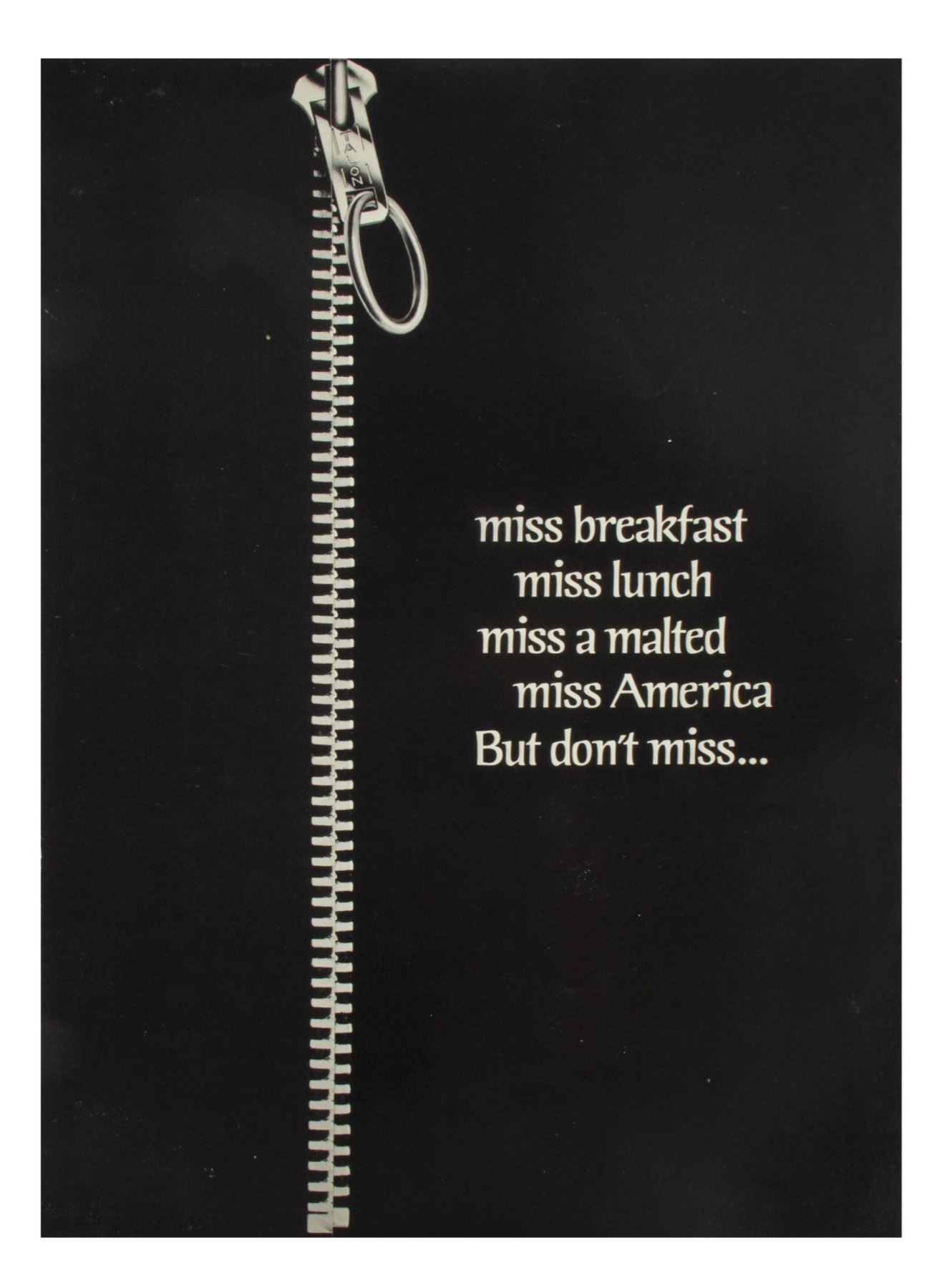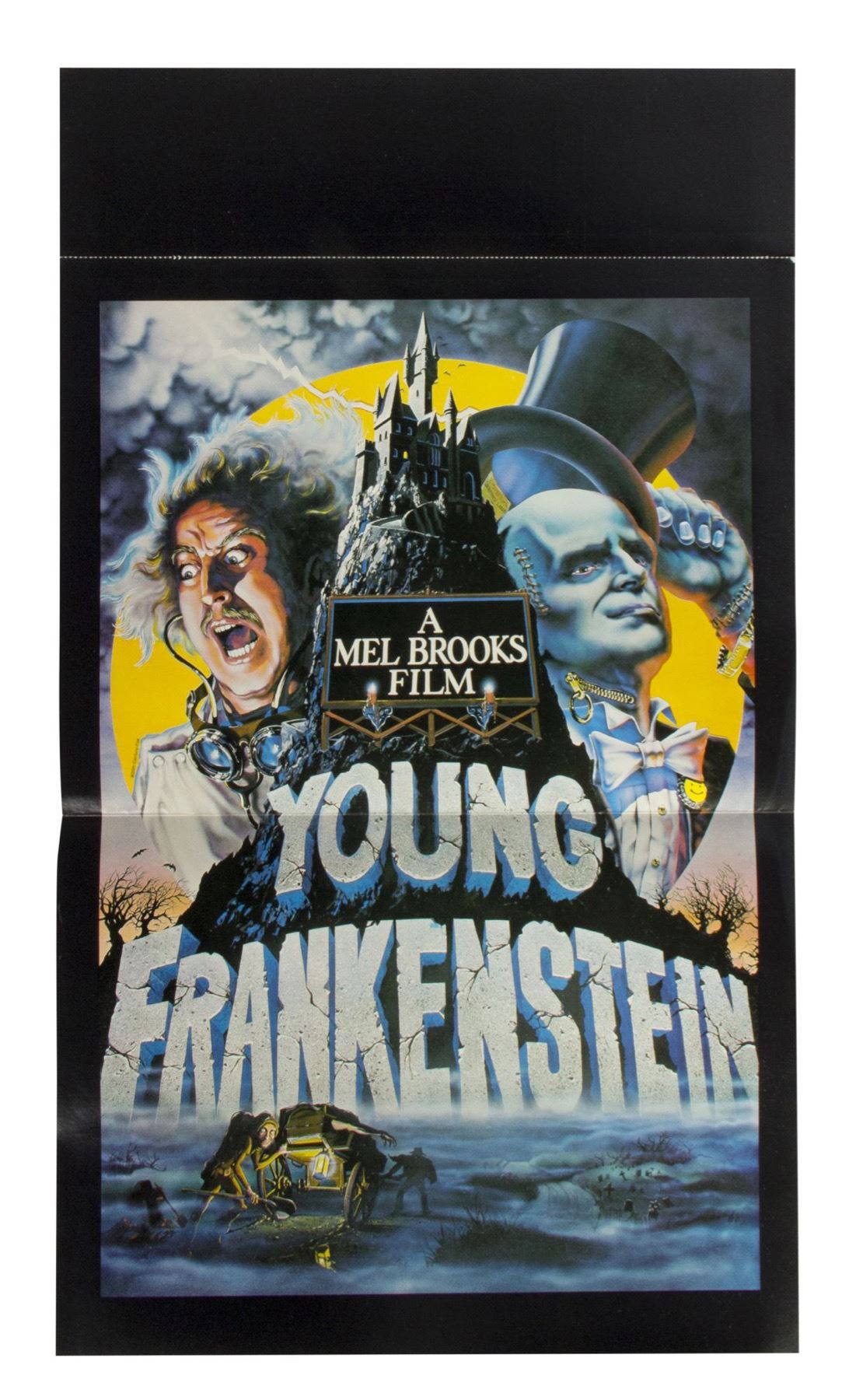 (20th Century Fox, 1974) A rare promotional folder for the cult classic feature film "Young Frankenstein". This promotional folder features a mock zipper on the front and the phrase "miss breakfast, miss lunch, miss a malted miss America, but don't miss..." and opens to reveal a large poster image for the production. The back of the folder lists the dates and locations of prominent theaters showing the film. Measuring 15"x11" closed and 15"x25" opened to reveal the poster, the folder is in good condition with some wear from use. The poster image has a top-portion with a perforated section that can be removed. That perforated portion has some separation towards the edges but is still intact.