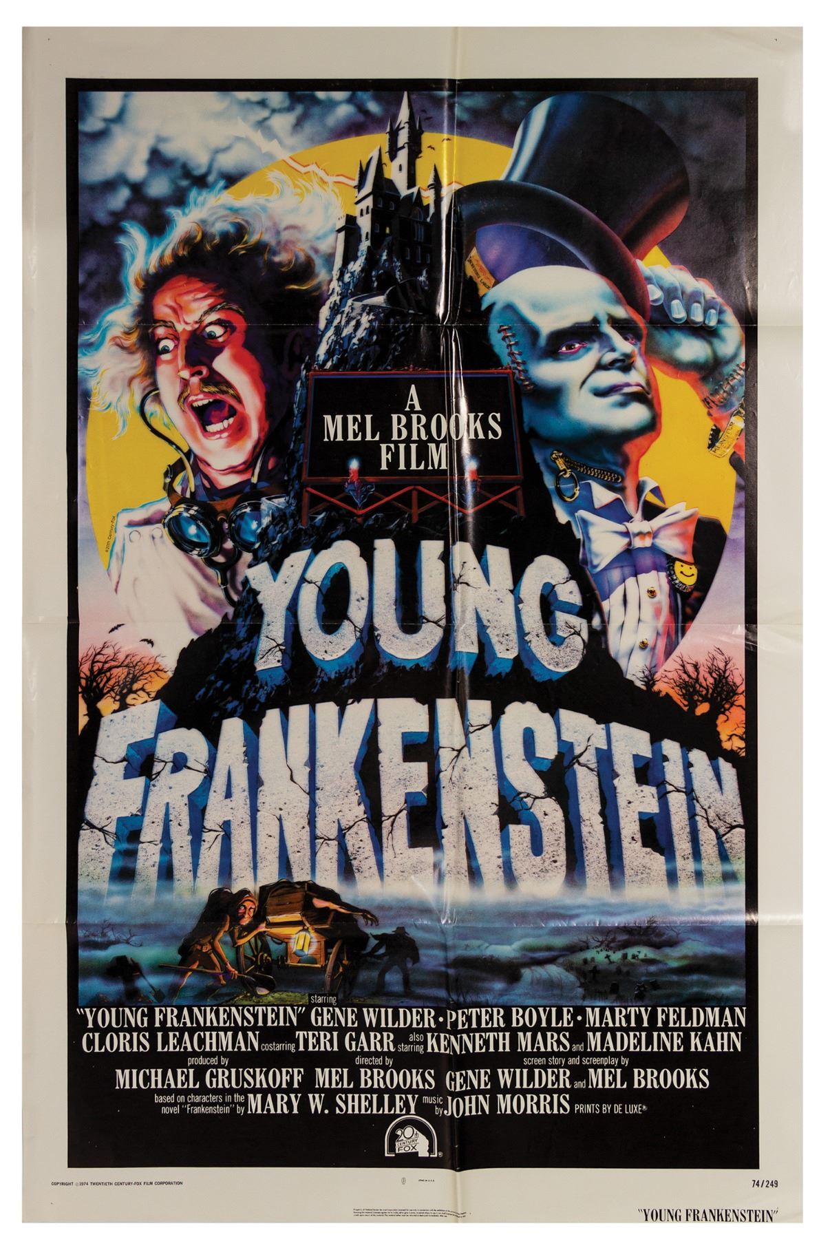 (20th Century Fox, 1974) A very rare one sheet poster for the theatrical release of Young Frankenstein. The poster features artwork by John Alvin, and depicts the films stars Gene Wilder, Peter Boyle, and Marty Feldman in their iconic roles as Dr. Frankenstein, Frankenstein's Monster, and Igor. This poster comes from the collection of Bill Wallen, who helped create promotional and advertising campaigns for the film. Measuring 41"x27", the poster is in good condition overall with minor wear and creases to its original fold-lines and along the edges.
