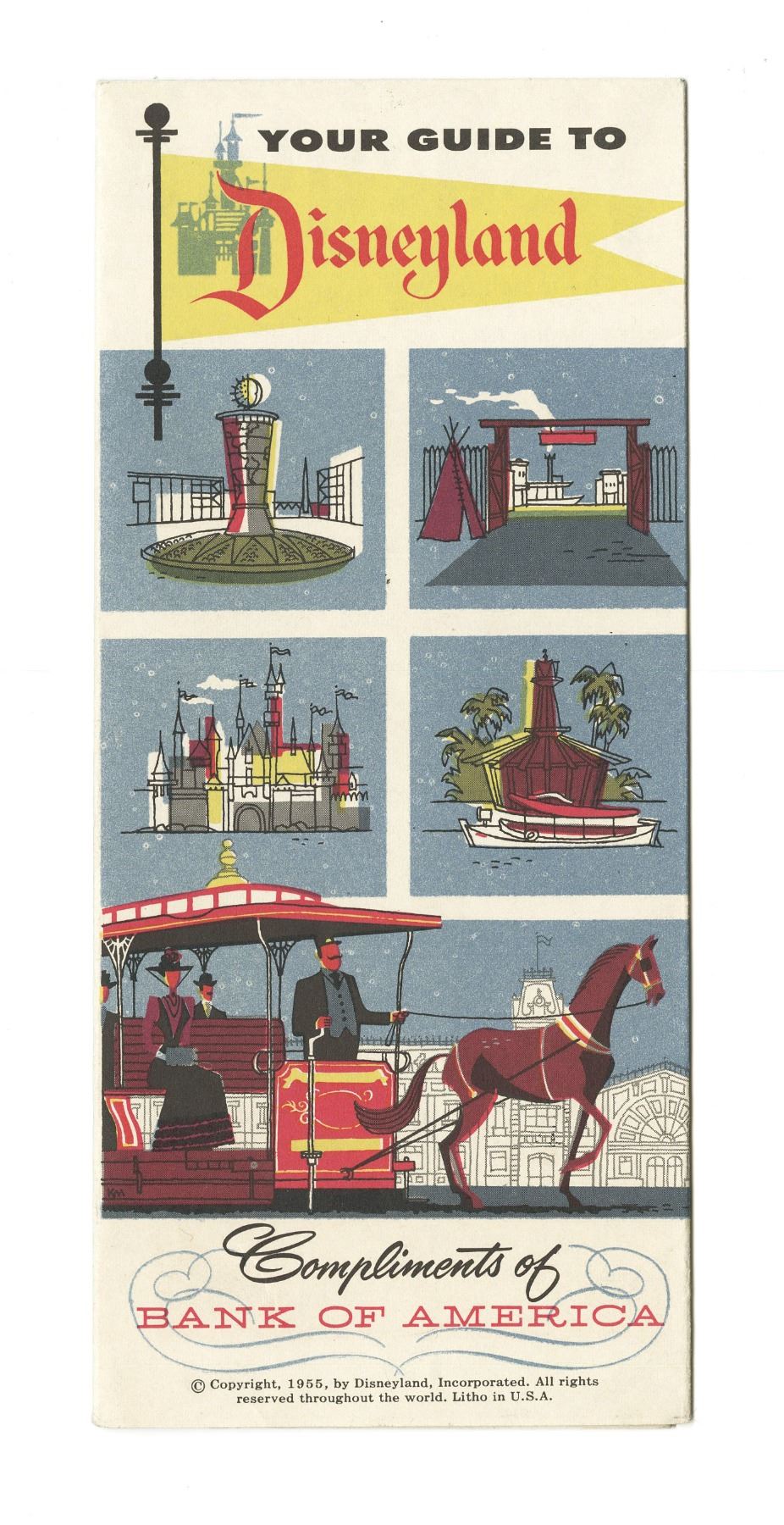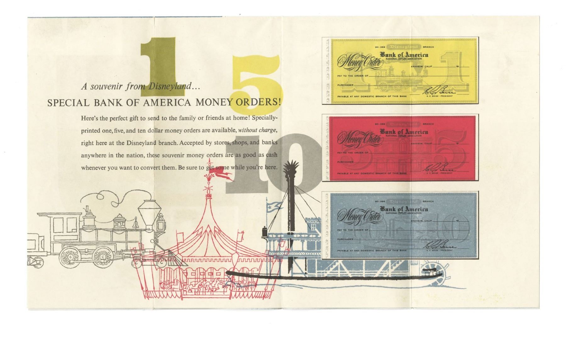 (Disneyland, 1955) An extremely rare brochure from Disneyland's Bank of America branch on Main Street. The brochure has illustrations depicting the different lands of the park on the cover, and contains a fold-out map of the park with information on Bank of America money orders. Measuring 8"x3.5", the brochure is in very good condition.