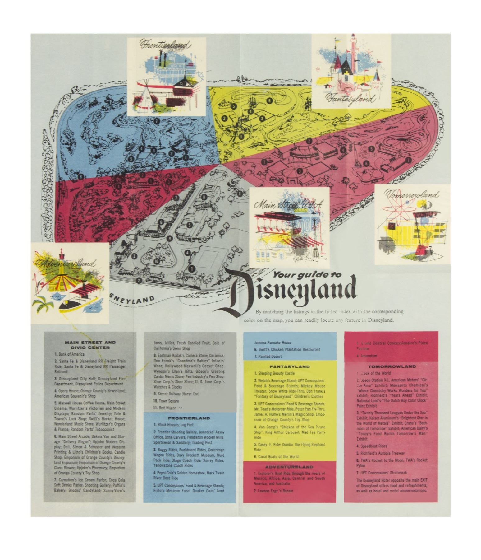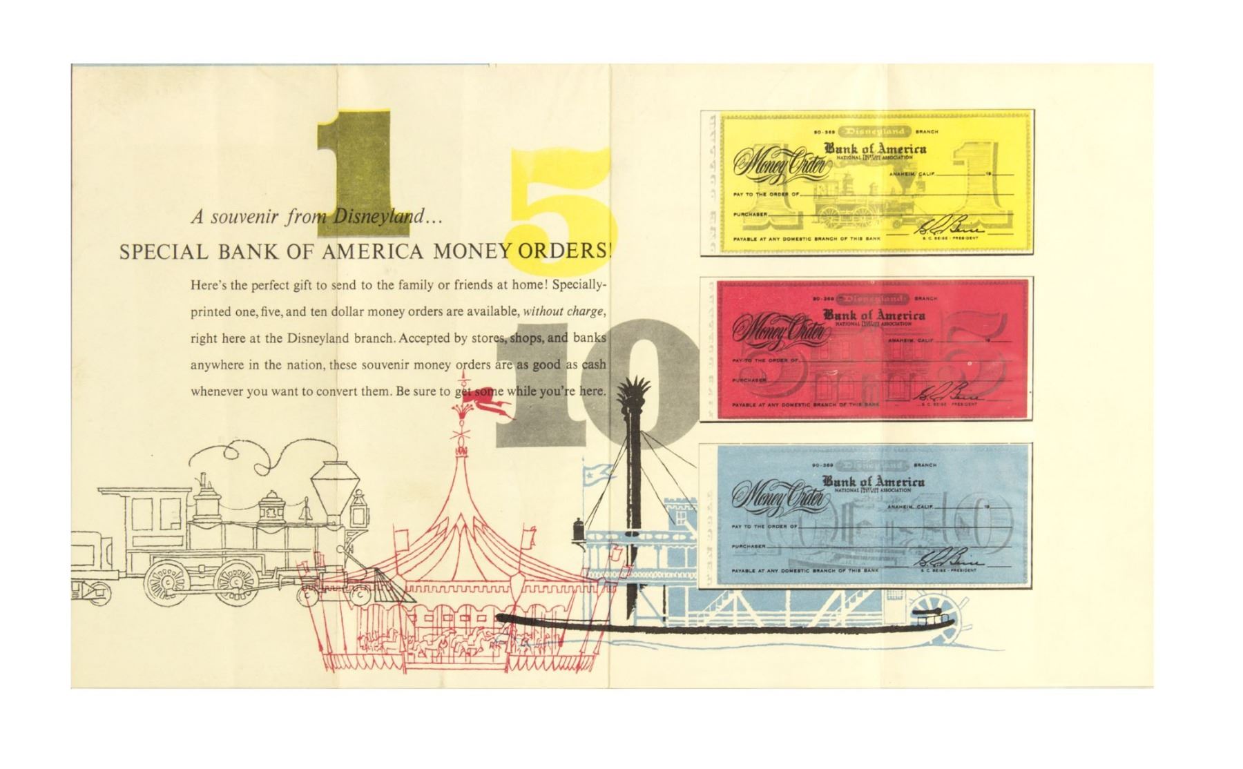(Disneyland, 1955) A rare guidebook created by Bank of America for Disneyland's opening year. Included are details of the different lands of the park, and an advertisement for Bank of America's Disneyland-themed money orders which were available at the park. The guidebook opens to reveal a beautiful illustrated park map and measures 8"x3.5" while folded. The condition is very good with minor wear. Below the map, there is a thin yellow mark which appears to be a printing flaw rather than a conditional defect.
