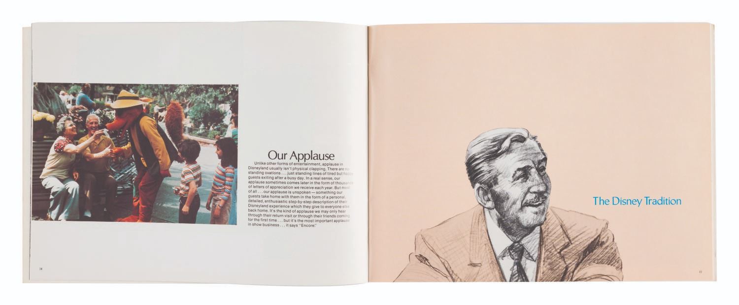 (Disneyland, 1973) A book created for new Disneyland cast members featuring a beautiful gold embossed Sleeping Beauty Castle logo on the cover. The 36-page book covers general expectations of Disneyland employees as well as a brief history of the Walt Disney Company's first 50 years. The book measures 8.5"x11.5" and is in very good condition with minor wear from handling.
