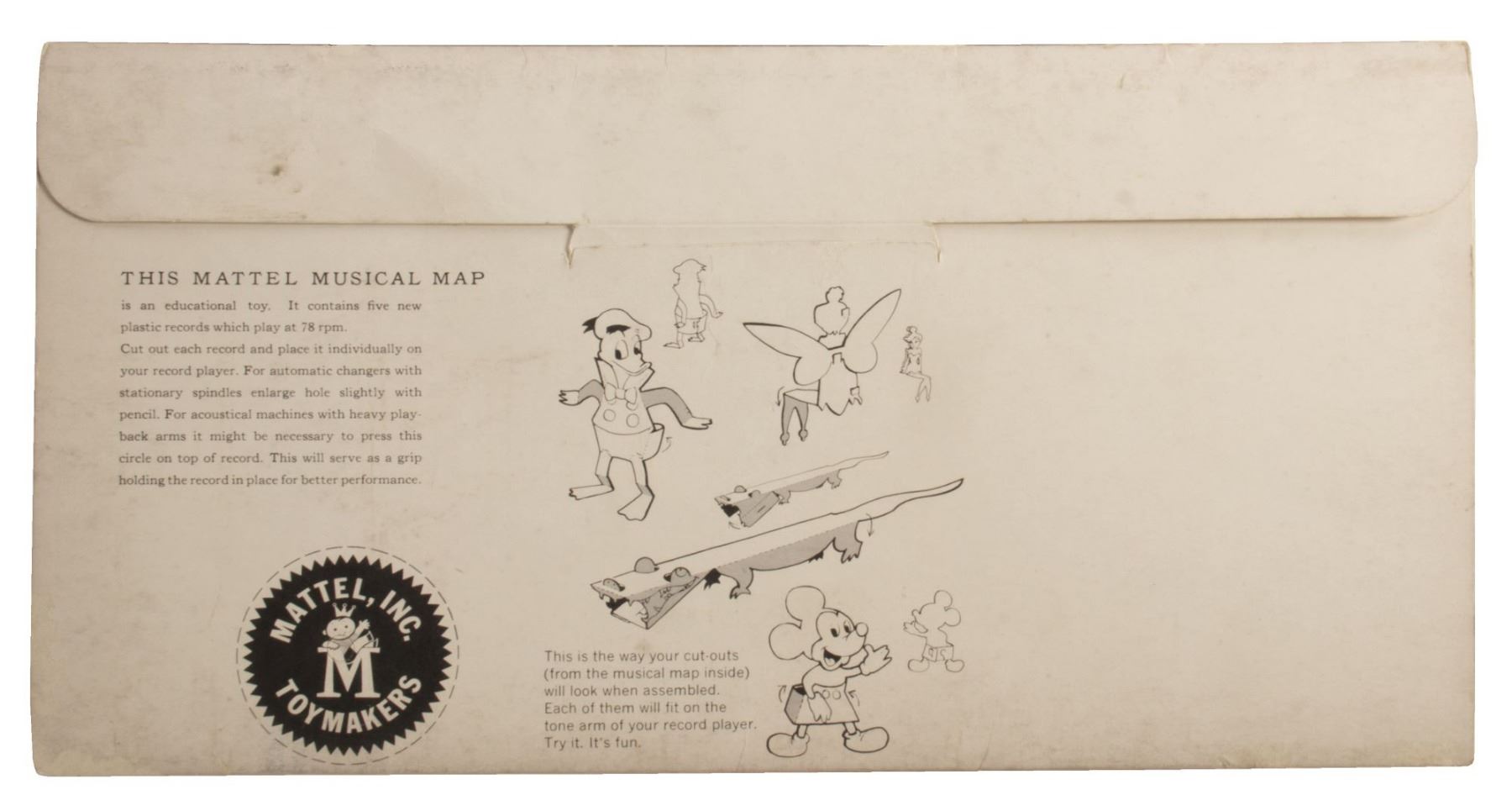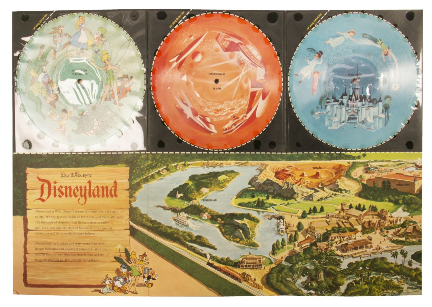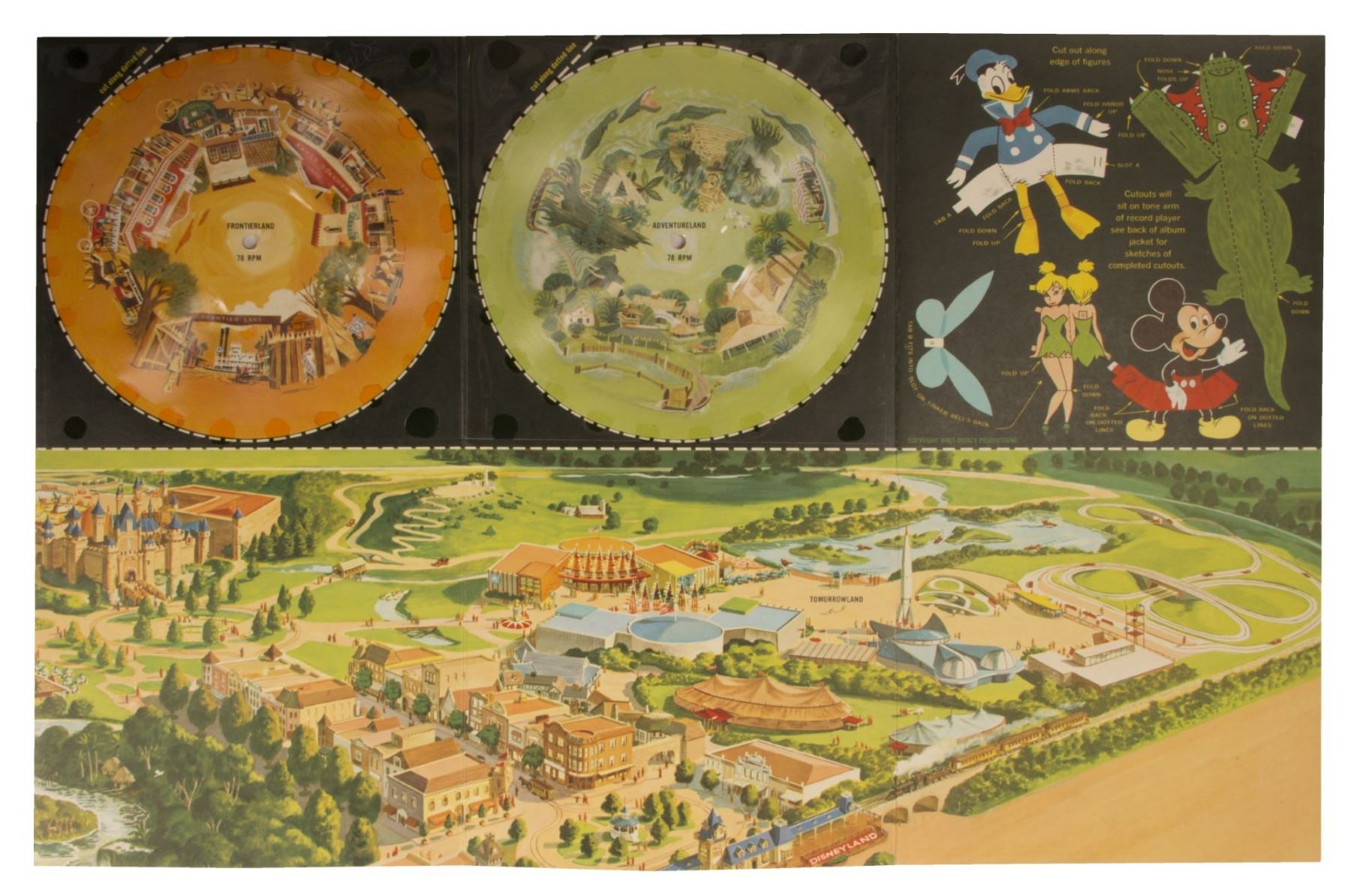 (Disneyland, 1955) An illustrated map and record set created by Mattel featuring five records with songs themed after each of the original lands of the park. The records are unused and have not been cut out from the large panorama map. When folded, the map measures 14.5"x7.5". The condition is fair, with some spots of discoloration and edge-wear. There is a slight wavy quality to the records.