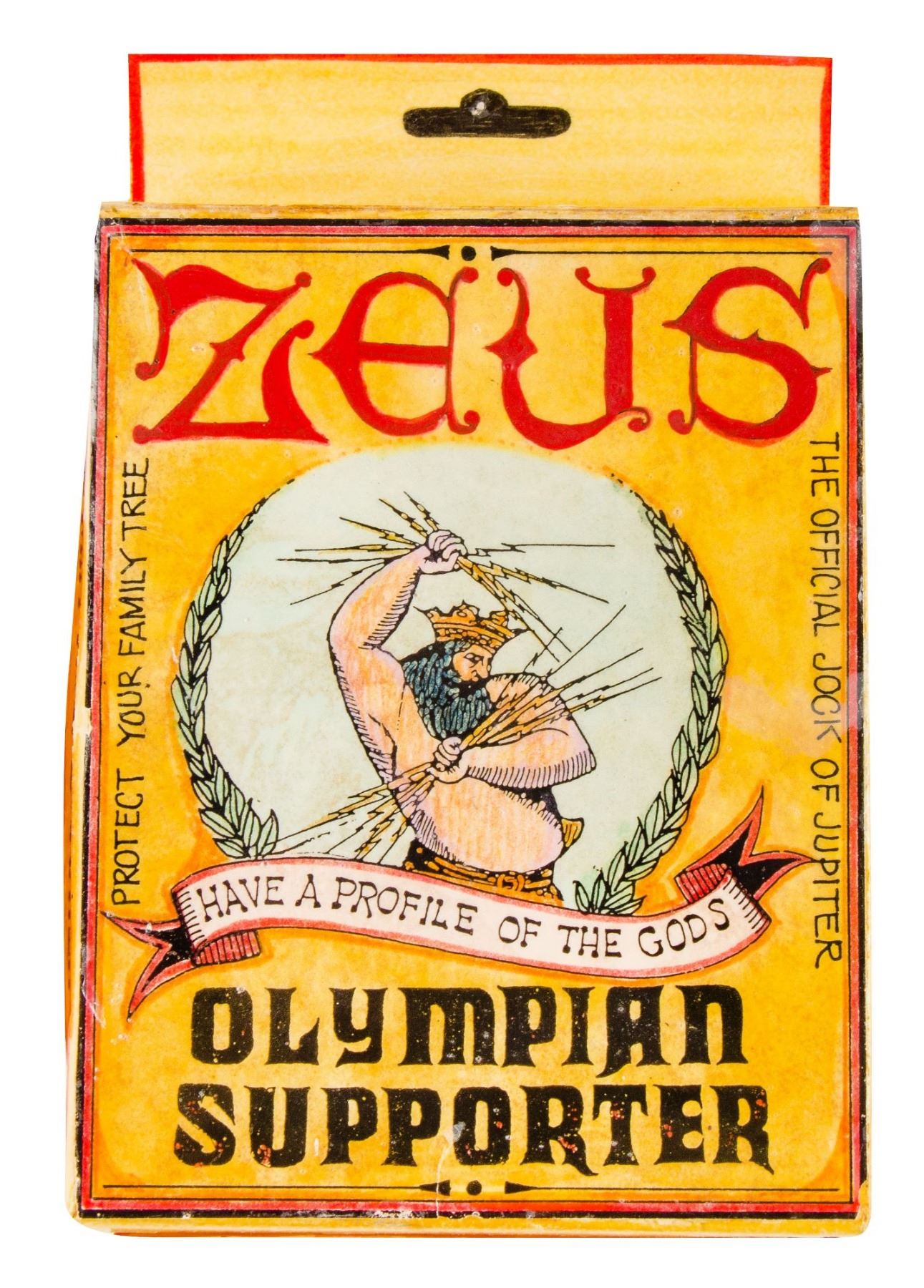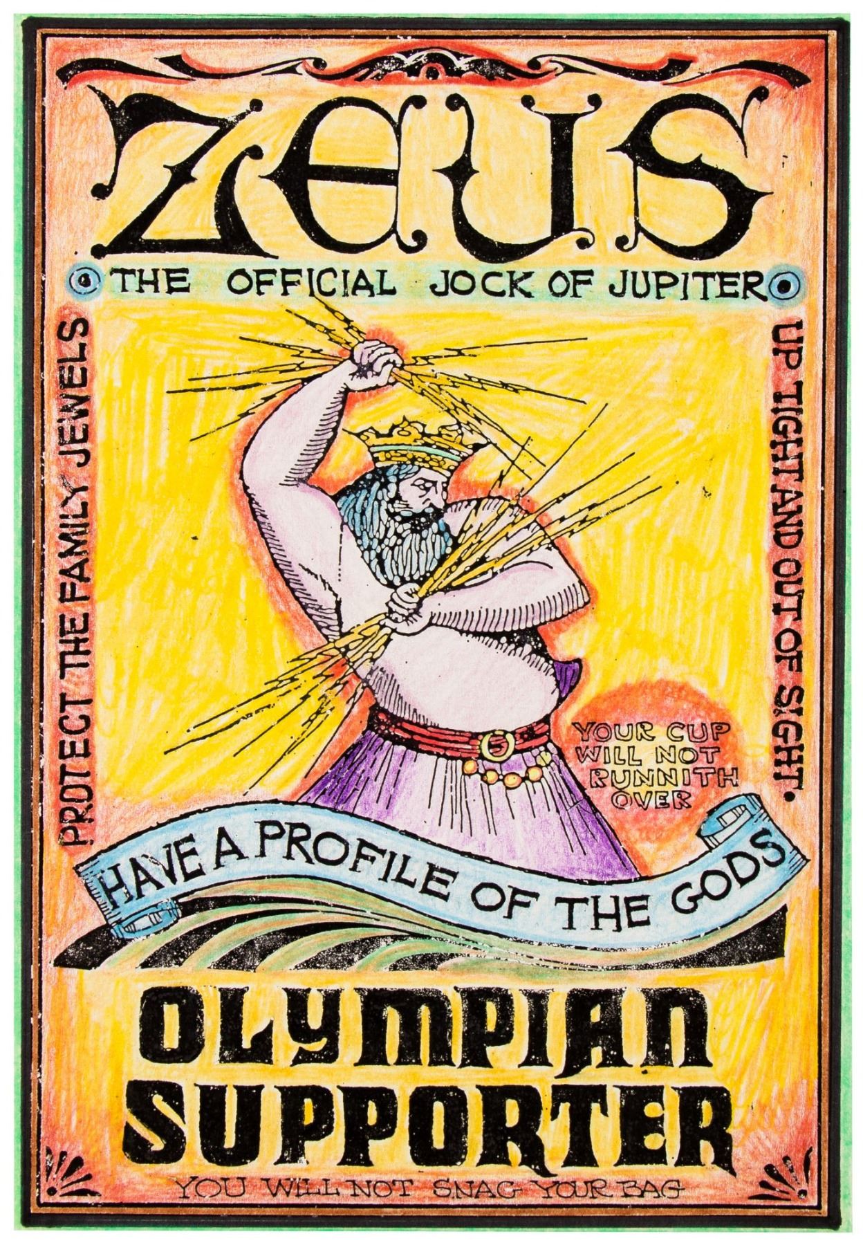 (1960s-70s) An original illustration by Rolly Crump for "Zeus" jock straps. This humorous artwork reads "Have a Profile of the Gods" and "Your Cup will not Runneth Over", is accomplished in ink and colored pencil over copied line-work. Included with the colored design is Rolly's prototype box for the packaging for the jock straps. The illustration measures 9.5"x6.5" and the prototype packaging measures approximately 7" tall. This set is in very good condition with minor wear from use.