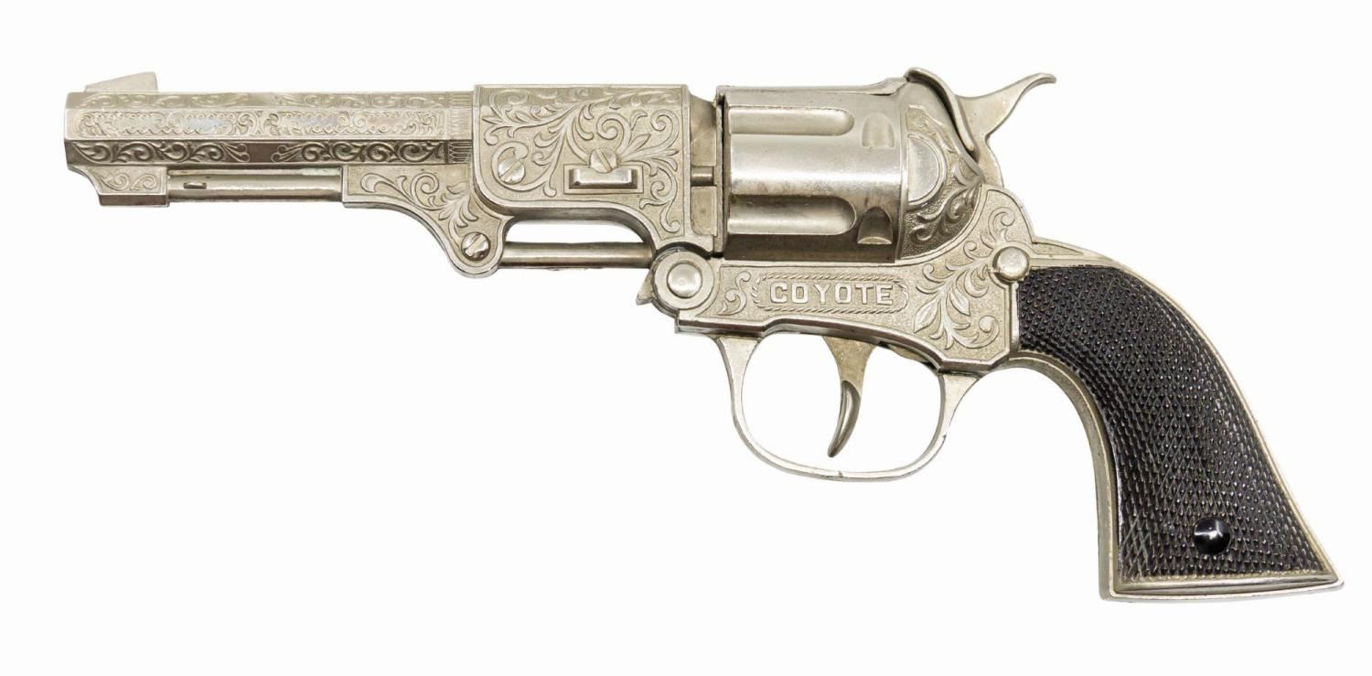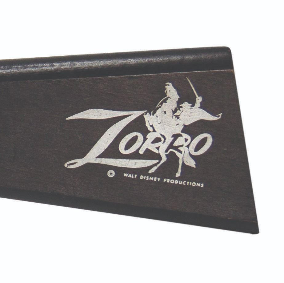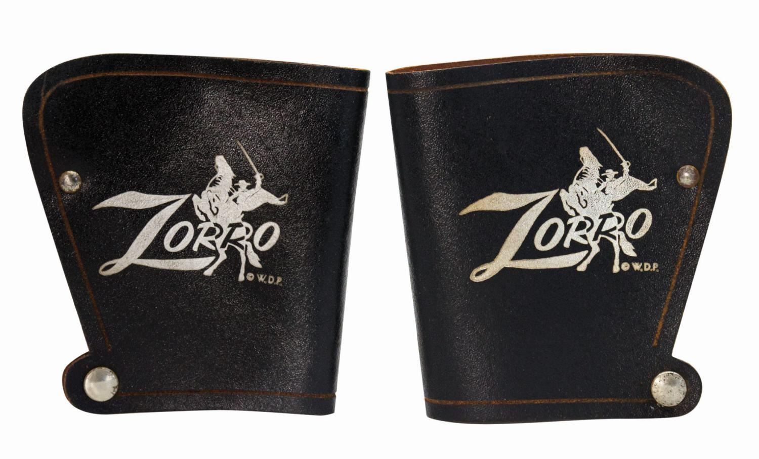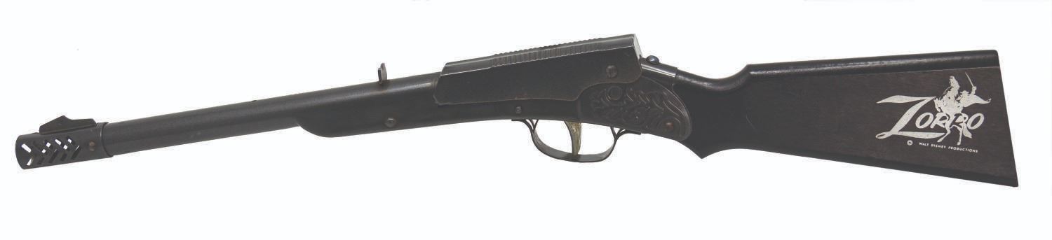 (Daisy, 1958) A rare Zorro Official Shooting Outfit manufactured by Daisy based on the popular Disney television character. The set includes a rifle, a cap revolver, a holster, a belt, and a pair of wrist gauntlets, a black leather belt with a metal stag's head buckle, a pair of black leather Zorro logo wrist gauntlets with metal snap closure, and an ornate gold and black leather handgun holster. The revolver breaks where the barrel meets the static cylinder to reveal a spool for roll caps. The firing mechanism is in working order. The belt measures 21" long, the rifle is 25" long, and the hand gun, 8.25" long. All items are in very good condition with some surface wear throughout.