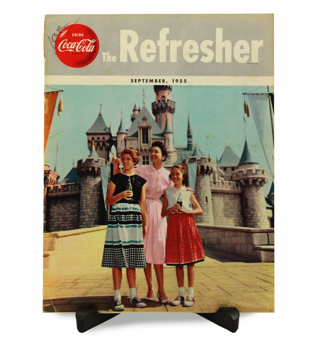 A very rare September, 1955 edition of Coca-Cola's "The Refresher" magazine. New issues of The Refresher were published monthly for the employees of The Coca-Cola Company. This issue highlights aspects of the park such as the Refreshment Corner on Main Street in Disneyland, which was built jointly by The Coca-Cola Company and the Coca-Cola Bottling Company of Los Angeles. This magazine is rich with beautiful photos and information from early days in the park. In fine condition, with some edge-wear and mild separation of the spine. The number 100 has been written in with pen on the top left corner of the cover.
