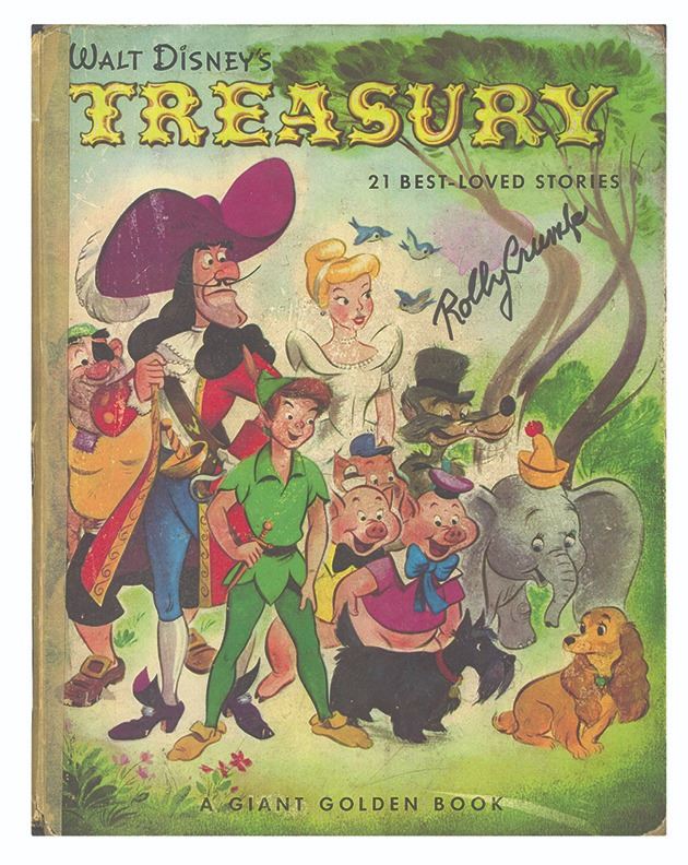 (Disney, c.1955-61/80s) A 39-page animator's Parody Book that was circulated internally for the artists at the Disney Studio in the 1950s. This book, based on the "Walt Disney's Treasury" Giant Golden Book, was drawn-over by the artists at the studio so that each page features the face of an animator or artist over the character which would have normally been depicted. The drawings were created between 1955 and 1961 and feature self-portrait parodies by such notable artists as Eyvind Earle, Rolly Crump, Walt Peregoy, Jack Kinney, Yale Gracey, Homer Jonas, Thelma Witmer, Frank Armitage, Paul Hartley, and many more. Although the original artwork was created prior to 1962, this copy was part of the personal collection of Rolly Crump and was likely printed around the 1980s. This copy is signed on the cover page by Rolly and measures 13"x10.75". The condition of this book is very good with minor edge-wear.