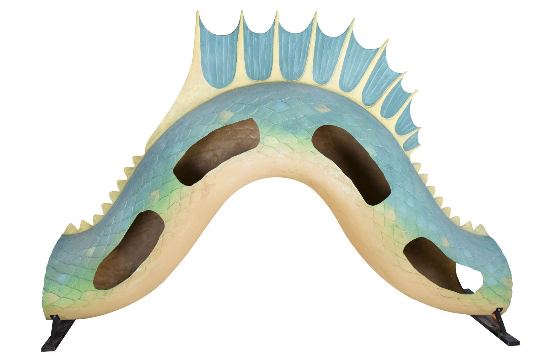 (Disneyland, 1959) Possibly the most iconic portion of the original "Submarine Voyage" attraction was its grand finale encounter with the giant Sea Serpent. This large animatronic prop from the Disneyland attraction entertained countless park guests over the years with its long body and comical googly-eyed expression. This Sea Serpent was a Disneyland icon for nearly 30 years before the attraction closed in 1998. This large animatronic prop was removed prior to the "Finding Nemo Submarine Voyage" refurbishment in 2007. The Sea Serpent is composed of five separate sections, which were disguised by rock formations in the attraction. Each section is made of hand-painted fiberglass which has been lightly touched up. The Sea Serpent was originally operated by pneumatic tubing, which has now been switched to electric so the figure can operate by a control switch. The head turns left to right and the eyes rotate in their familiar, comical way. Both moving aspects can be activated together or independently from one another. This incredible Disneyland artifact measures an impressive combined 48ft long, 6ft tall, and 3ft wide. The Sea Serpent is in very good restored condition, with some expected minor wear throughout from use. This item will require special shipping arrangements. Please inquire before bidding.