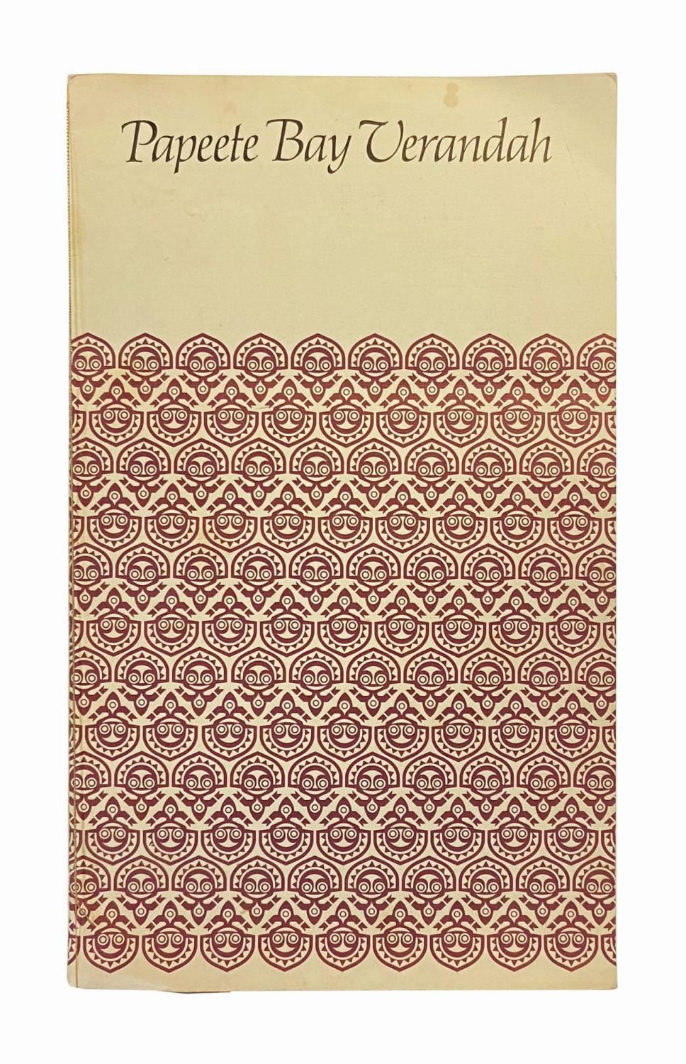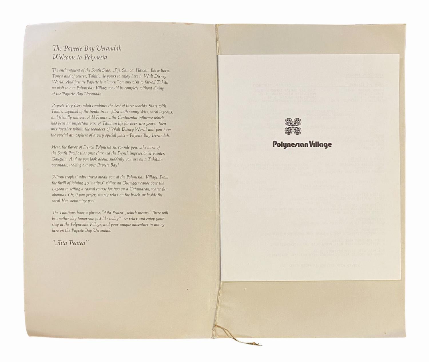 (Polynesian Resort, c.1970s) A rare Papeete Bay Verandah menu from Walt Disney World Resort's Polynesian Village. The large menu folder features a printed tiki god pattern called "Florida," traveling from the front to the back covers. A whimsical statement of concept is printed on the interior front cover, and a list of the elegant eatery's island-inflected cuisine is printed on two interior pages, bound into the folder with a metallic gold colored elastic cord. Measuring 15"x9", the menu folder is in good condition with some handling creases at the top and bottom, and spot staining from restaurant use.