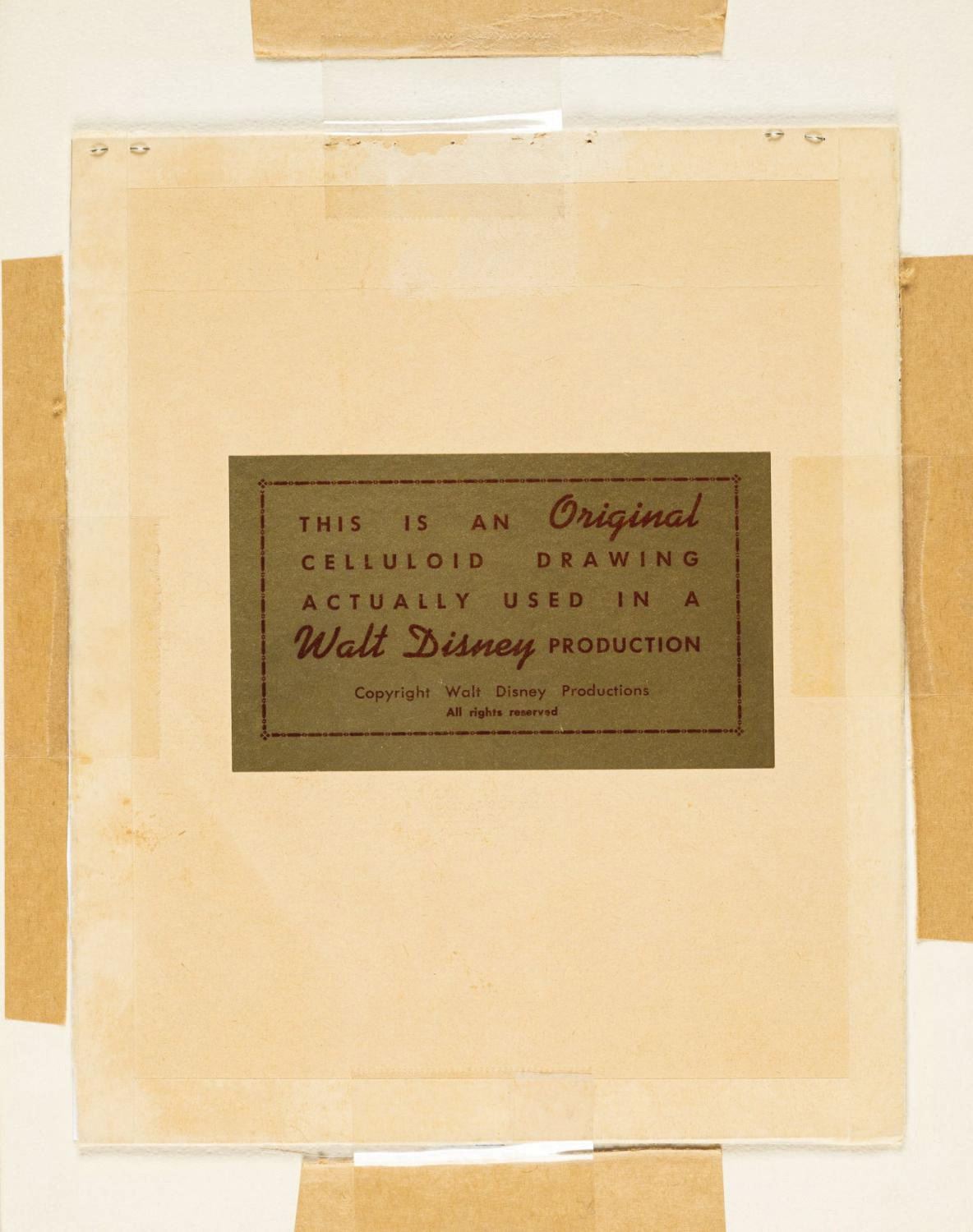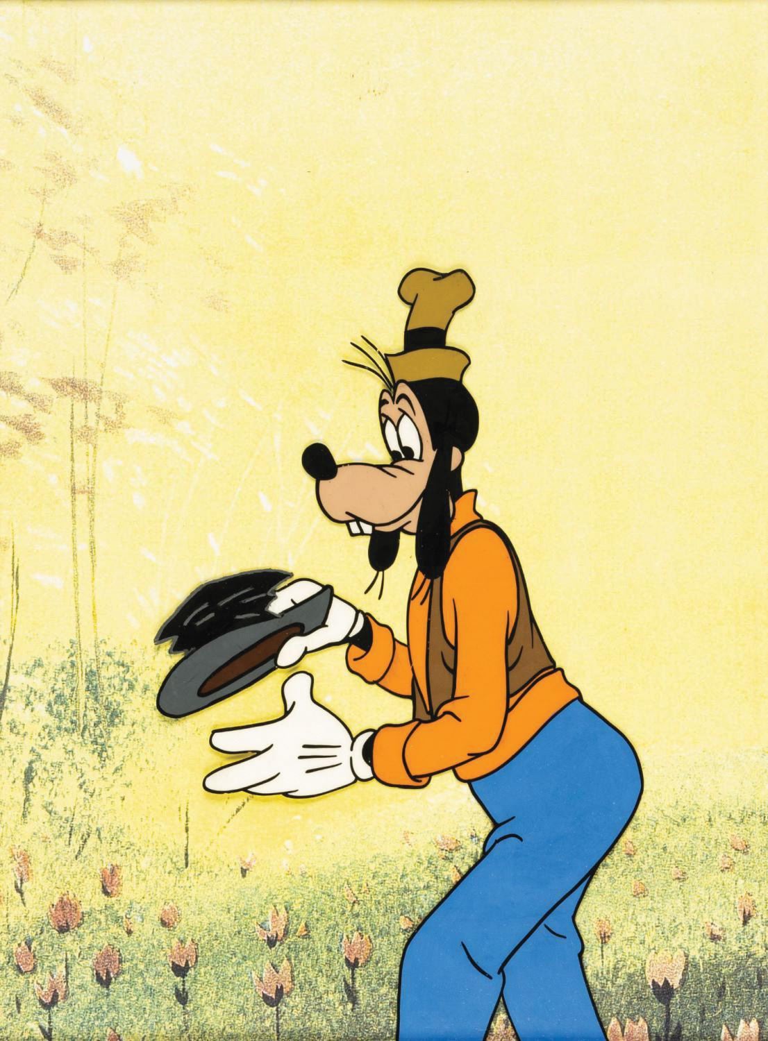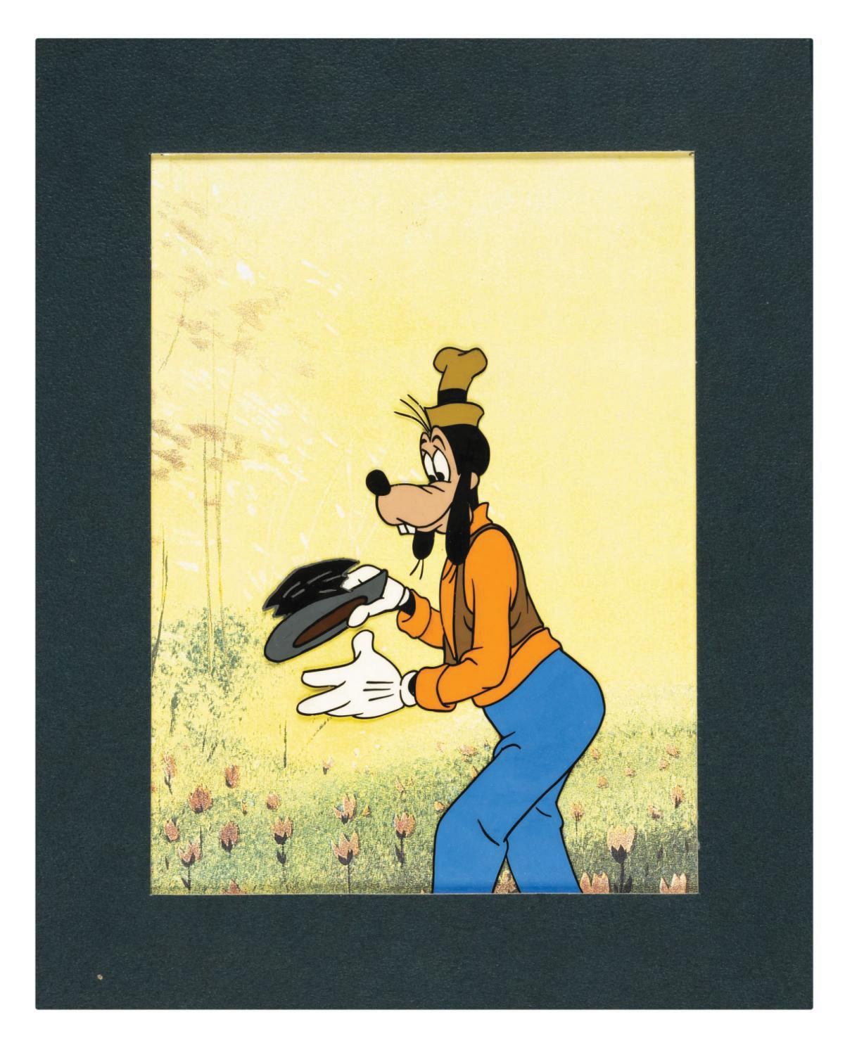 (Disney, 1950s-60s) A production cel of Goofy used in one of his television appearances of the 1950s and 1960s. The cel was trimmed and placed over a printed background for sale at the Disneyland Art Corner. The piece has a 7.25"x5.5" viewable image size within its 10"x8" mat, and a painted character size of 5.5"x3.75". The item is in fine condition, with only minor edge wear to the mat, and retaining a "Walt Disney Original" label on the reverse.
