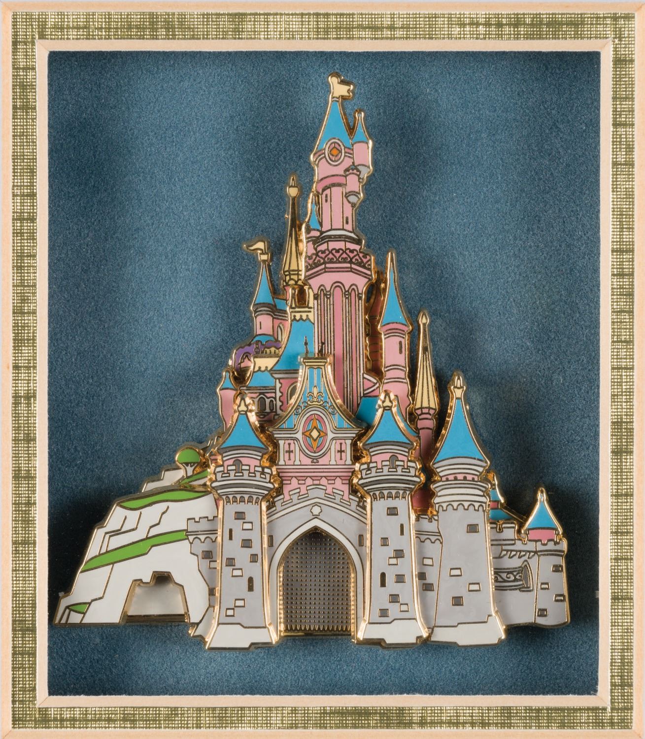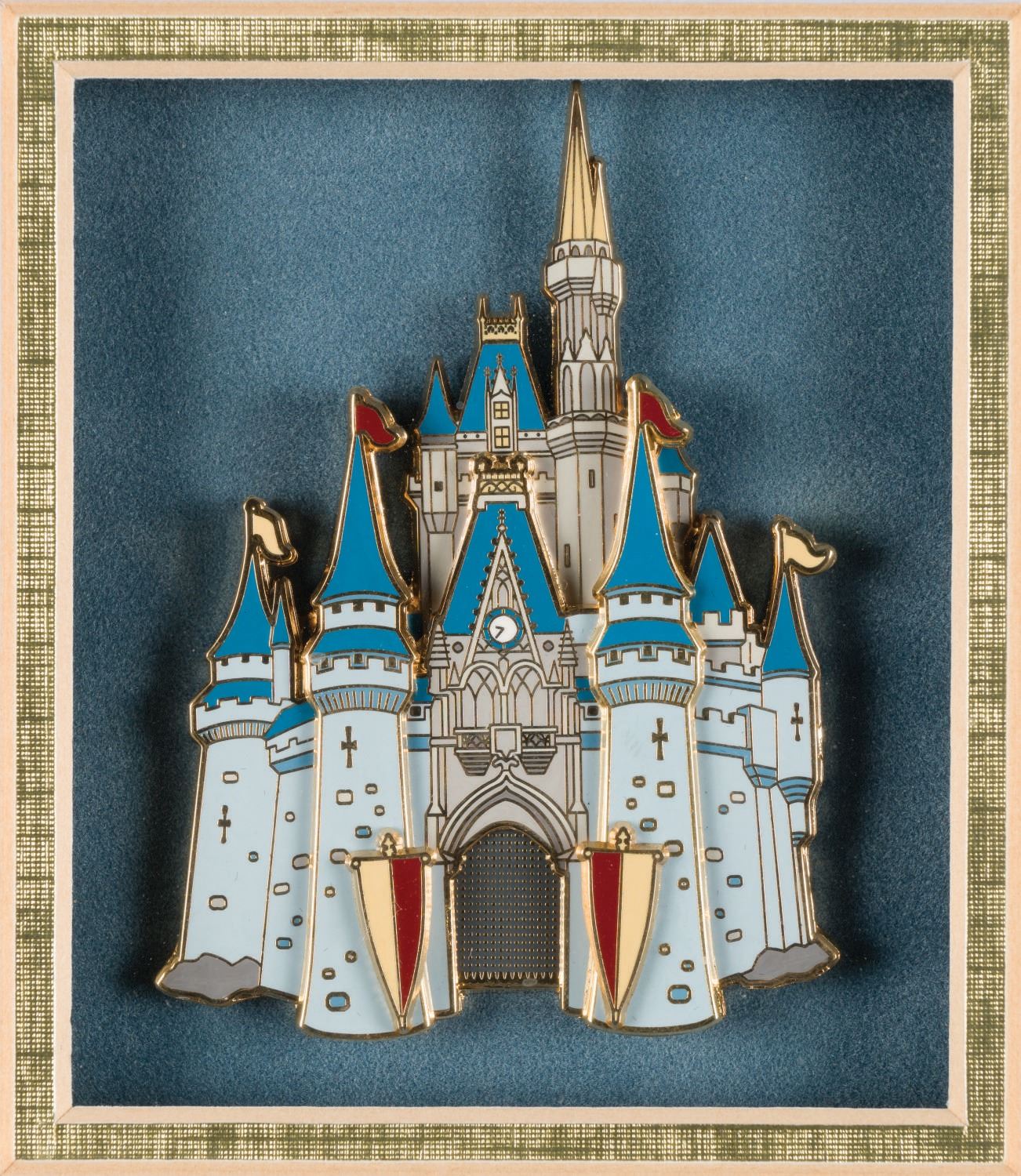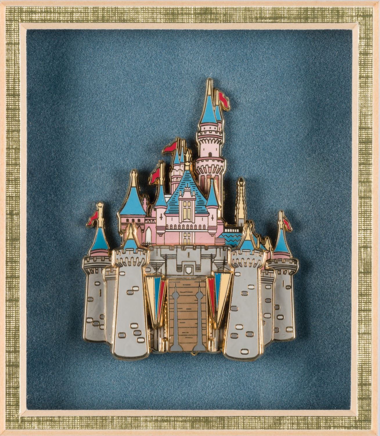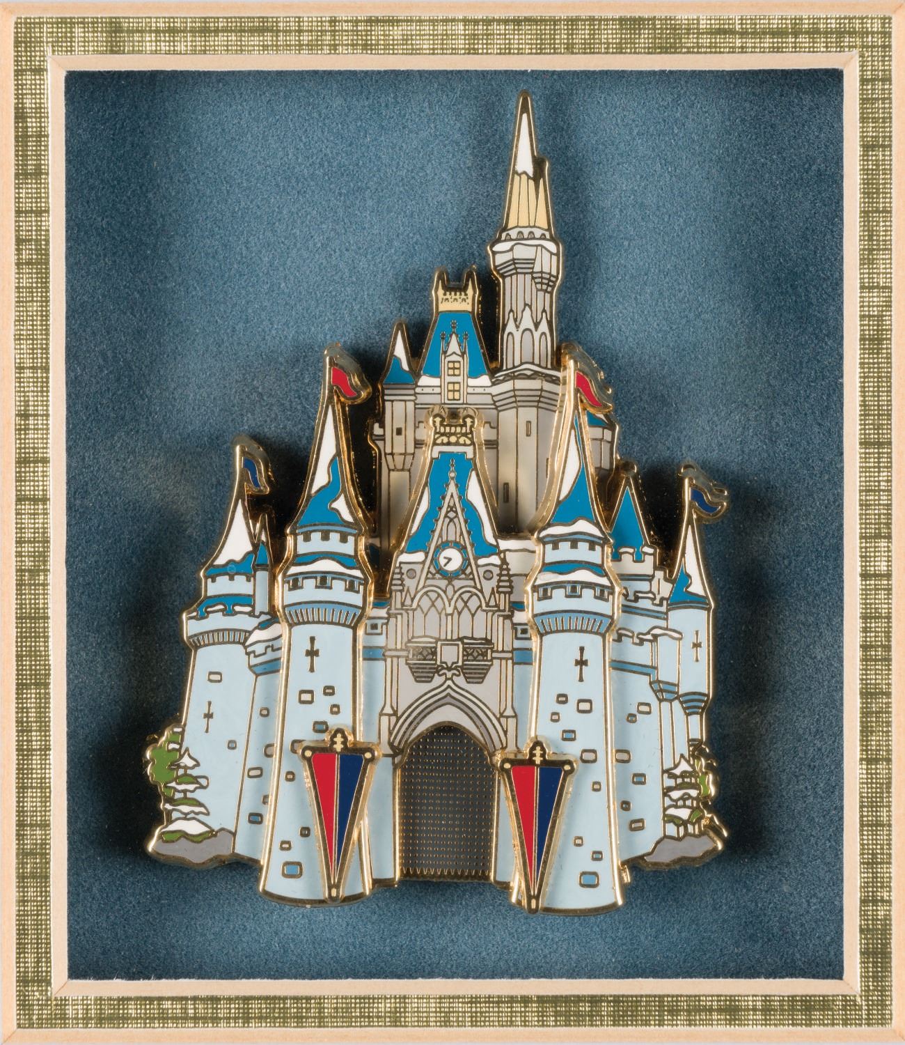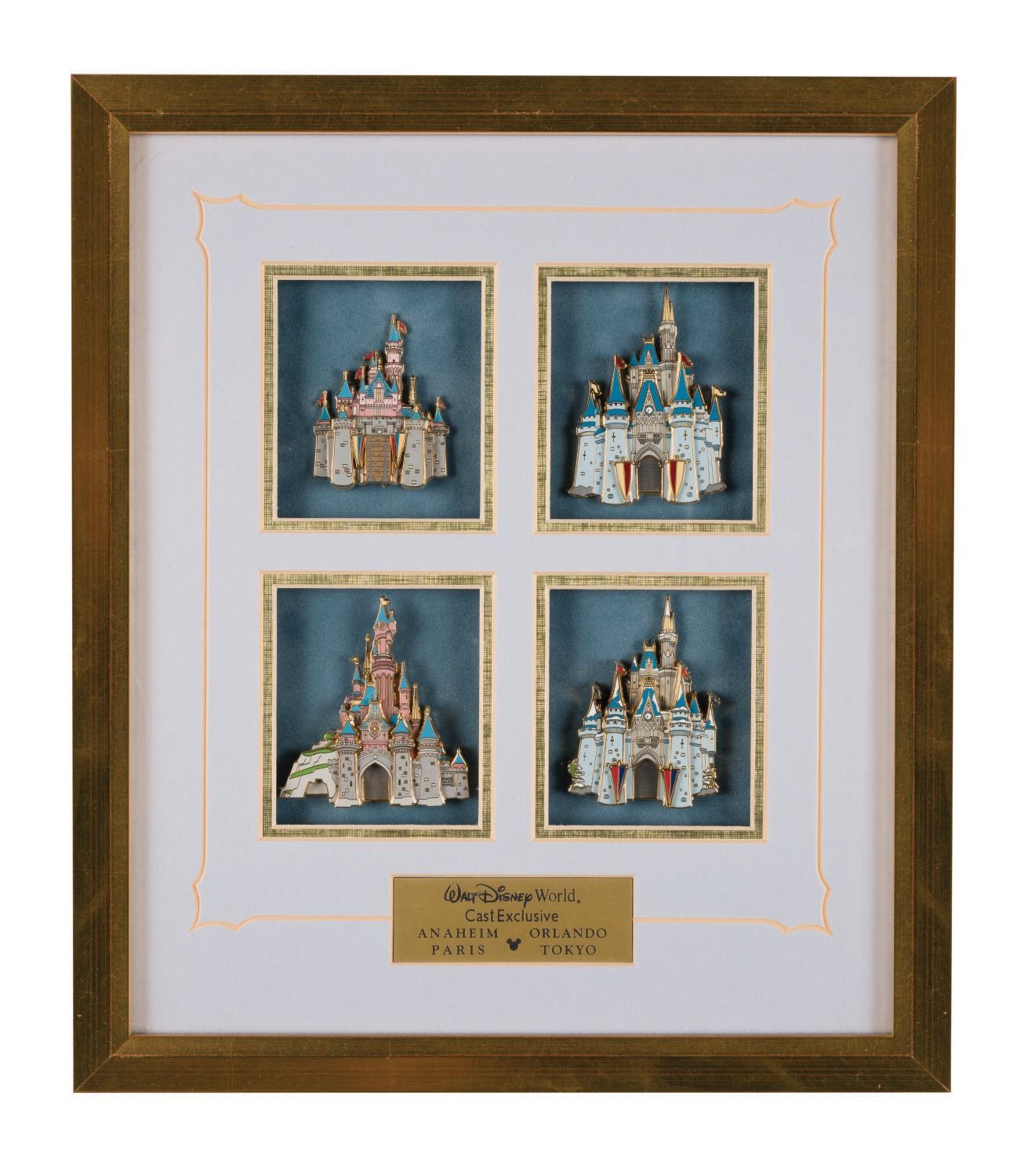 (Disney World, 2003) A framed set of (4) jumbo castle pins released exclusively for Walt Disney World Cast Members. The jumbo cloisonne pieces are of dimensional "pin-on-pin" design and each have additional sliding features (drawbridges and gates) revealing hidden scenes. Measuring 2.75"x2" to 2.75"x3.25", the pins are in very fine condition within their original fine condition 14.75"x12.75" frame.
