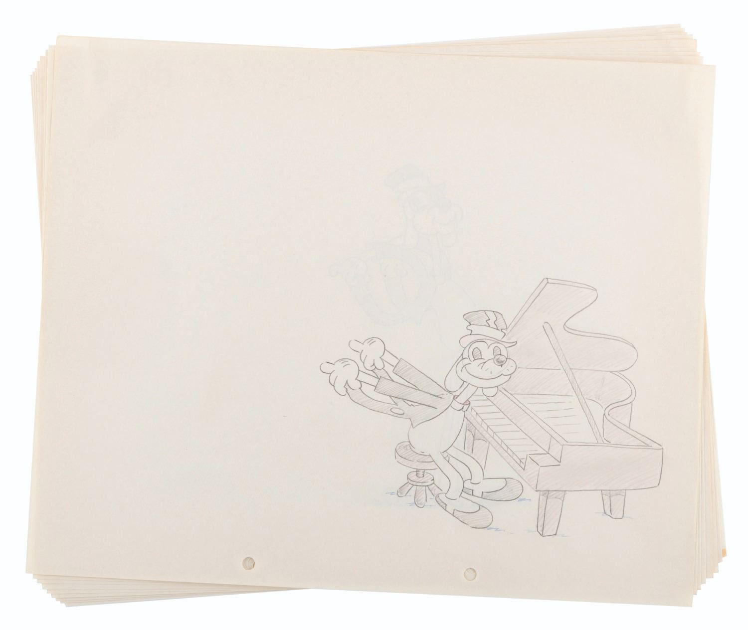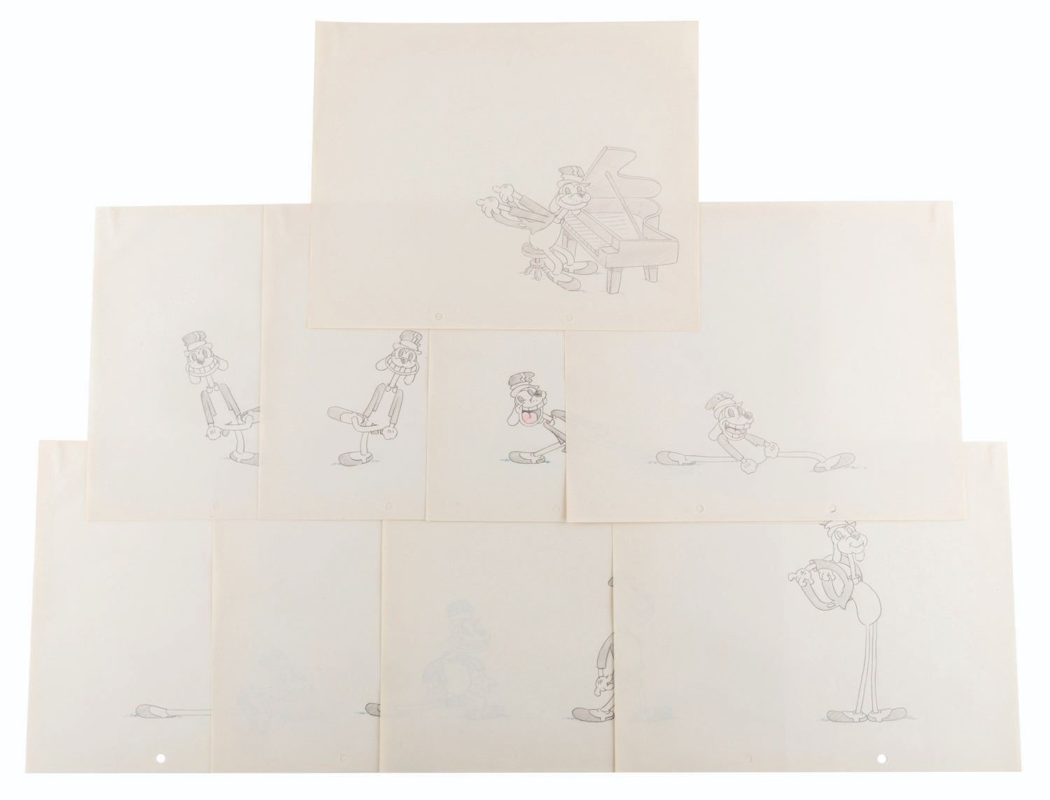 (Harman-Ising, 1932) A collection of nine storyboard drawings of Goopy from his debut Merrie Melodies short “Goopy Geer.” Accomplished in graphite and colored pencil with character image sizes ranging from 4” x 3” to 4.75” x 6.5”, the 9.75” x 12” drawings are in good to very good condition with light edge wear and creasing from production use, one with a few small stains, and light discoloration from age.