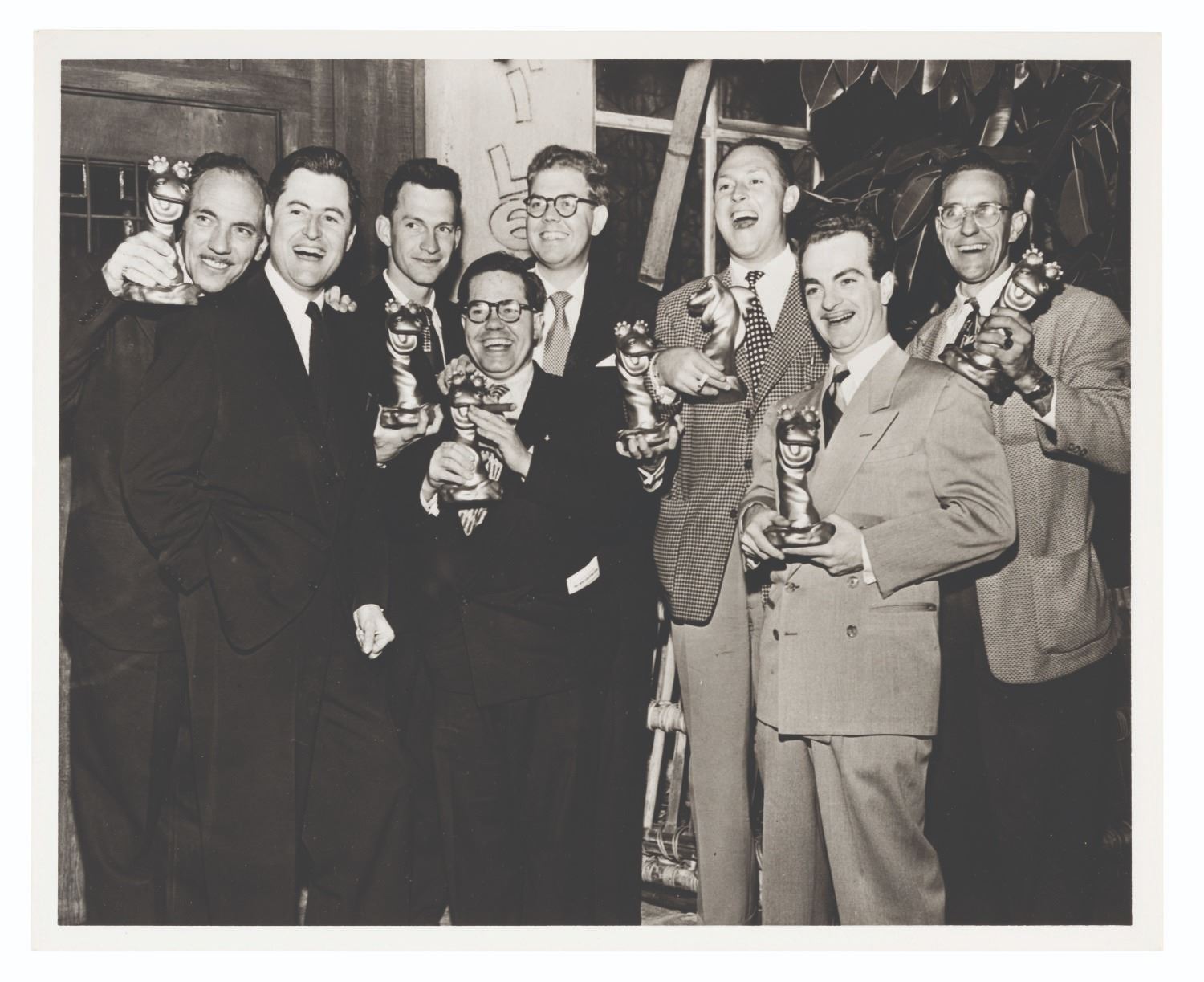 (Clampett, 1950s) A photograph of Bob Clampett and the “Time for Beany” crew with their Golden Cecil Award, an in-house award created by Clampett. Pictured from left to right are Paul Sells, Clampett, Walker Edmiston, Daws Butler, Stan Freberg, Lloyd Turner, Irv Shoemaker, and Ralph Loretz. Measuring 8” x 10”, the photograph is in very good condition.