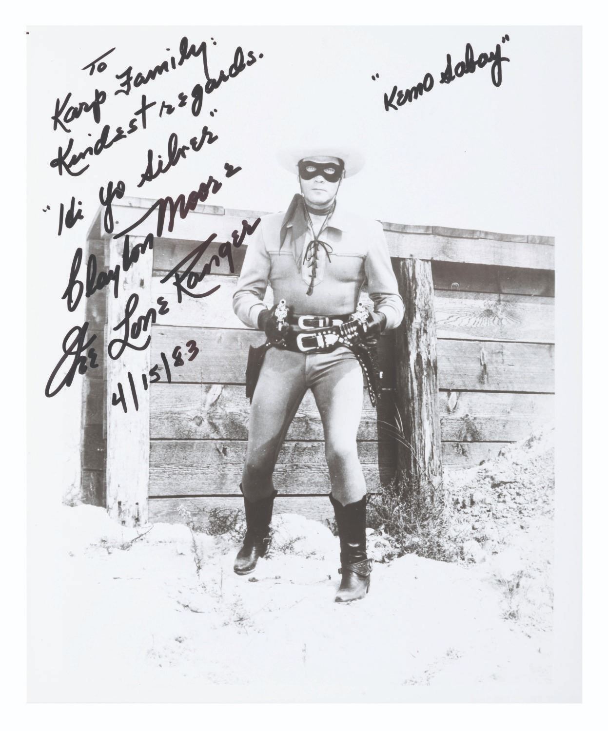 (ABC, 1983) A black and white Clayton Moore "The Lone Ranger” photo, signed with a personalized dedication in black marker. Measuring 8” x 9.75”, the photo displays in very good condition with scratches and light wear.