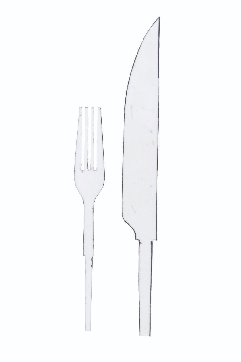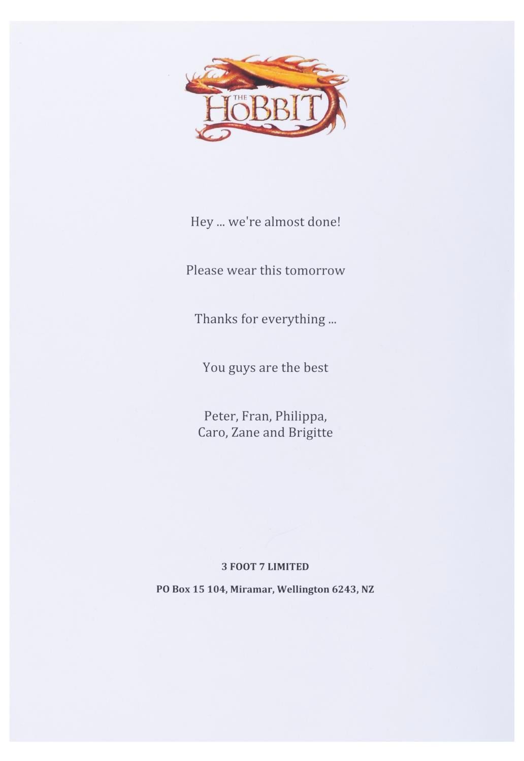(Warner Bros., 2012) A collection of Bilbo’s costume and prop pieces from "An Unexpected Journey." Included are a production mold for a Bilbo armor prototype with three resin casts, two templates for Bilbo’s cutlery at Bag End, a test piece of a leather satchel embossed with a warg (wolf), and a printed thank you note from director Peter Jackson and the Producers. Ranging in size from a 1.5” x 2.25” test casting to the 7” x 6” knife template, the items are in good condition with typical wear from production use including scuffs, scratches, chips, and soiling.