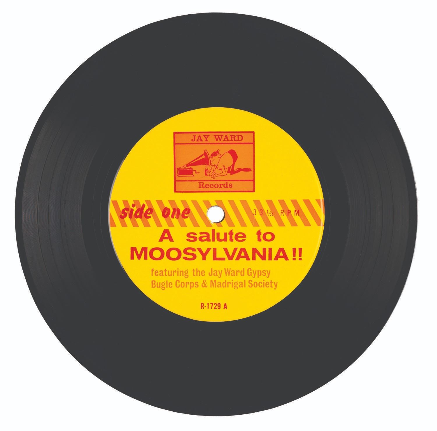 (Ward, 1962) “A Salute To Moosylvania!!” 33 ½ RPM vinyl record by the Jay Ward Gypsy Bugle Corps & Madrigal Society. This novelty record features nine tracks and was created by Ward to support his "Statehood for Moosylvania" campaign. Measuring 7”, the record is in fine playable condition and does not include the original sleeve.