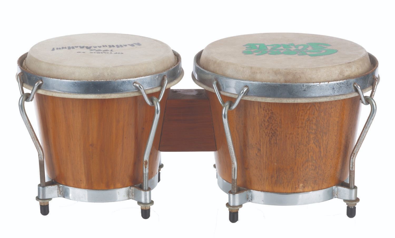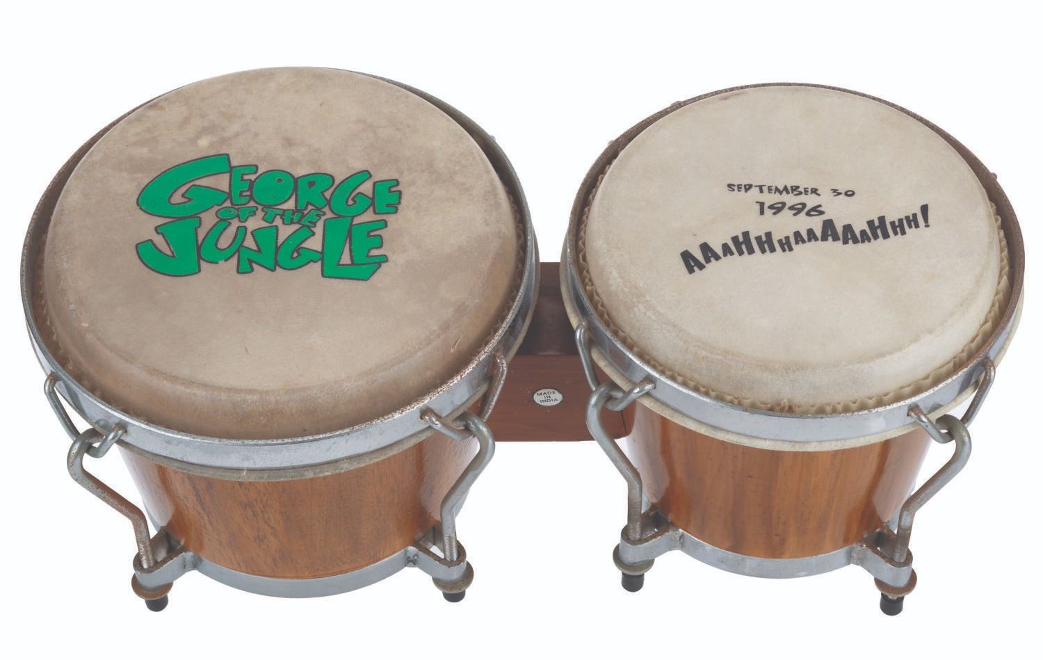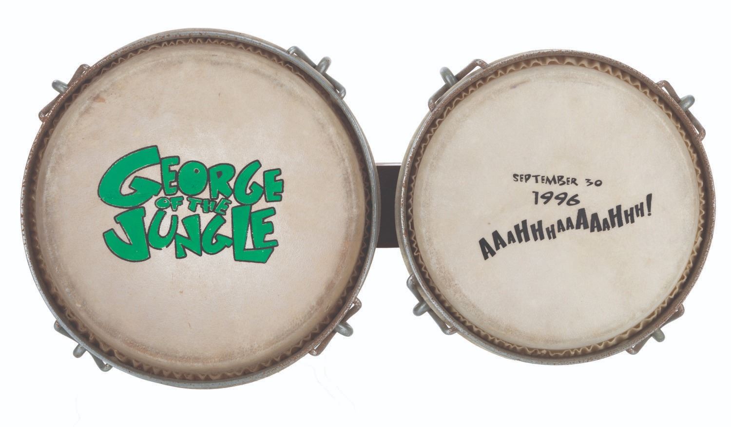 (Disney, 1996) A bongo set gifted to the cast and crew of the live-action “George of the Jungle” film on the first day of filming, September 30, 1996. Measuring 7” x 15.5” x 7” tall, the bongos display in very good condition with oxidation to the metal, scuffs, and light wear.