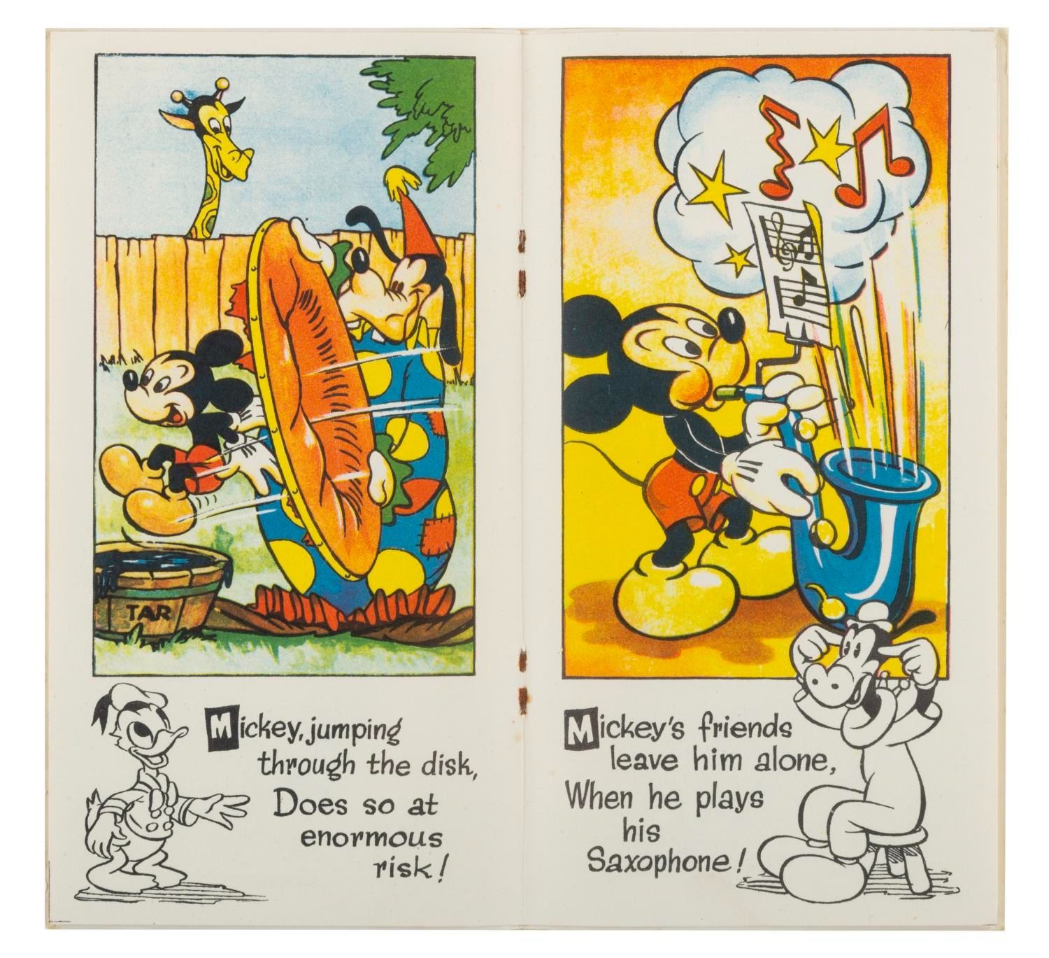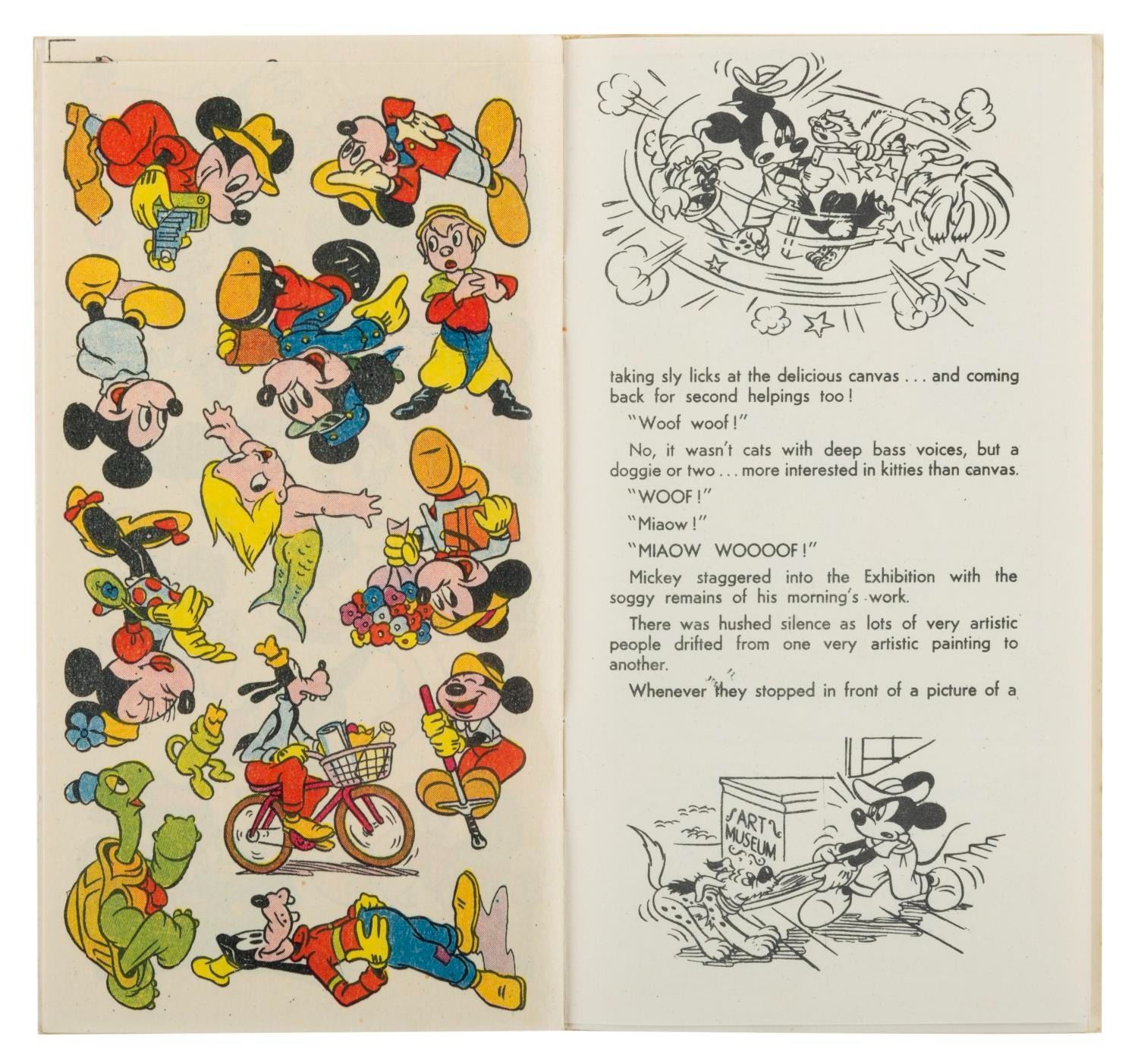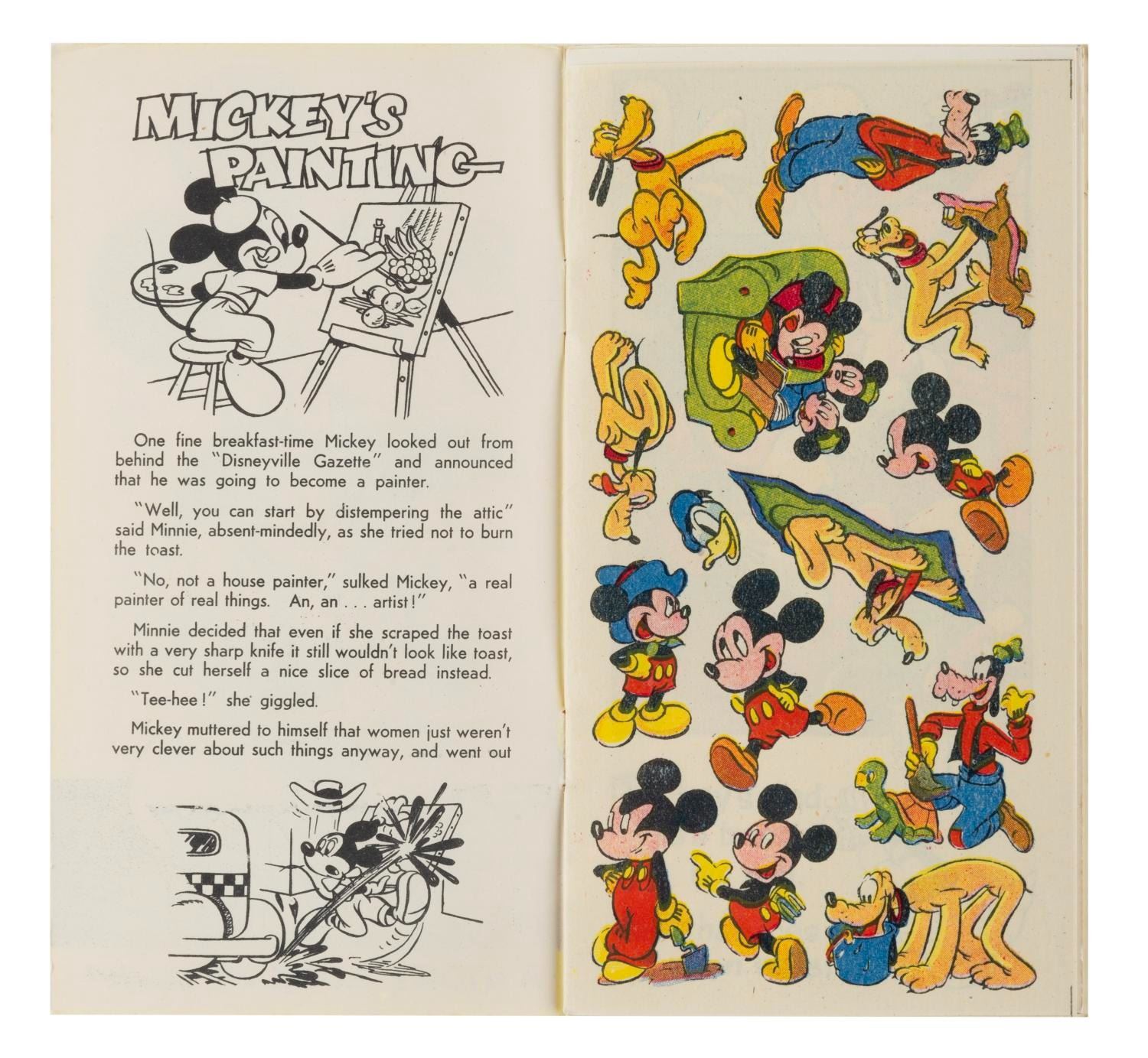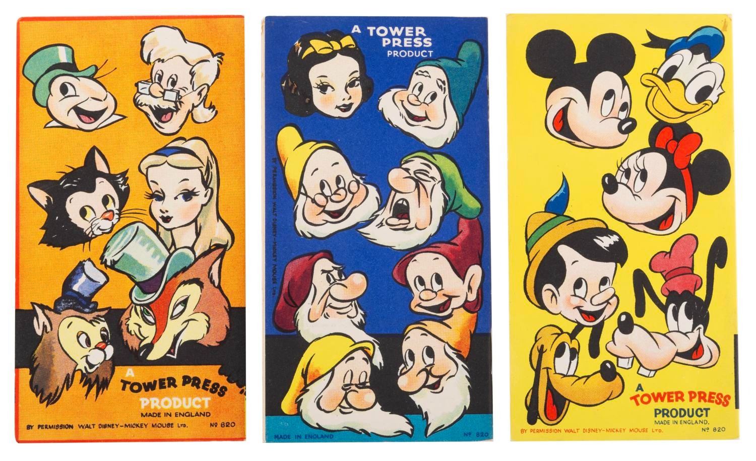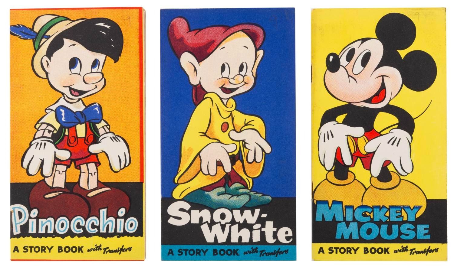 (Tower Press, 1940s) Three Disney Character Story Books with Transfers. Included are Pinocchio, Snow-White, and Mickey Mouse story books, each complete with six pages of full-color transfers. Measuring 3.75” x 7” each, the books are in very good condition with light wear from handling to the covers including a price notation in pencil.