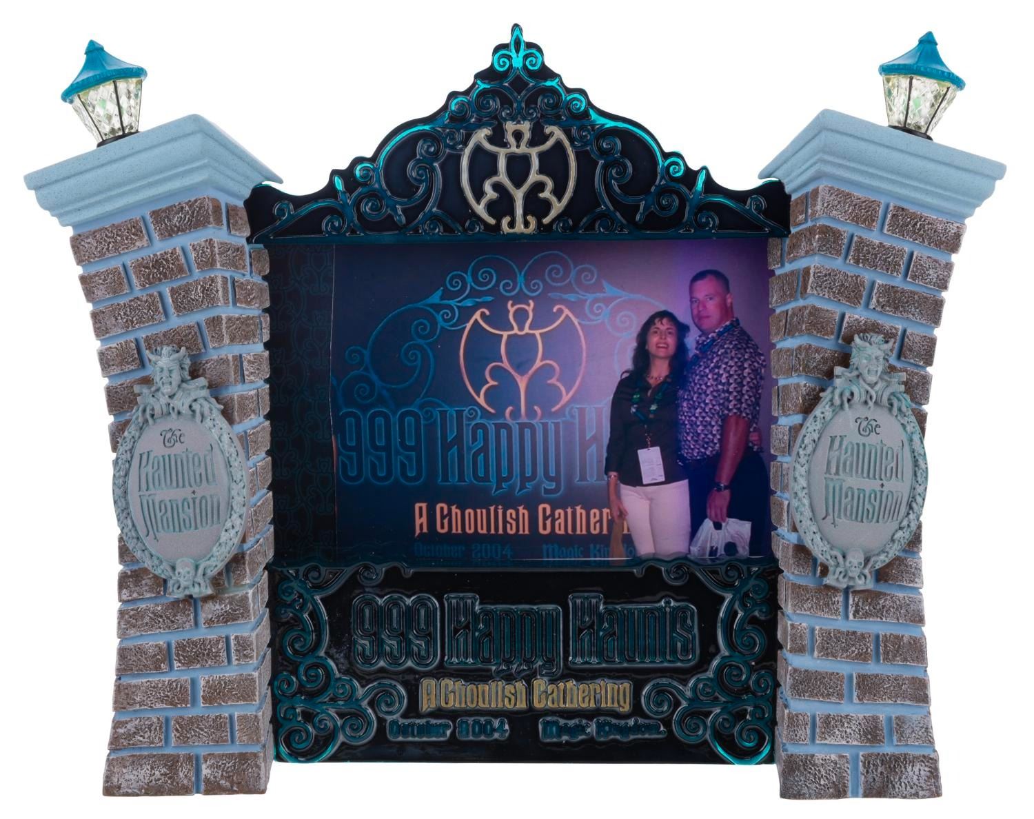 (Walt Disney World, 2004) A Haunted Mansion Ghoulish Gathering frame designed by Disney Artist Martha Widener and released at the 999 Happy Haunts event at the Magic Kingdom in 2004. With two"AAA" batteries (not included), the lamps glow green, and worked when tested. Released in an edition size of 500, the resin frame measuring 10.5" x 8" displays in fine working condition.