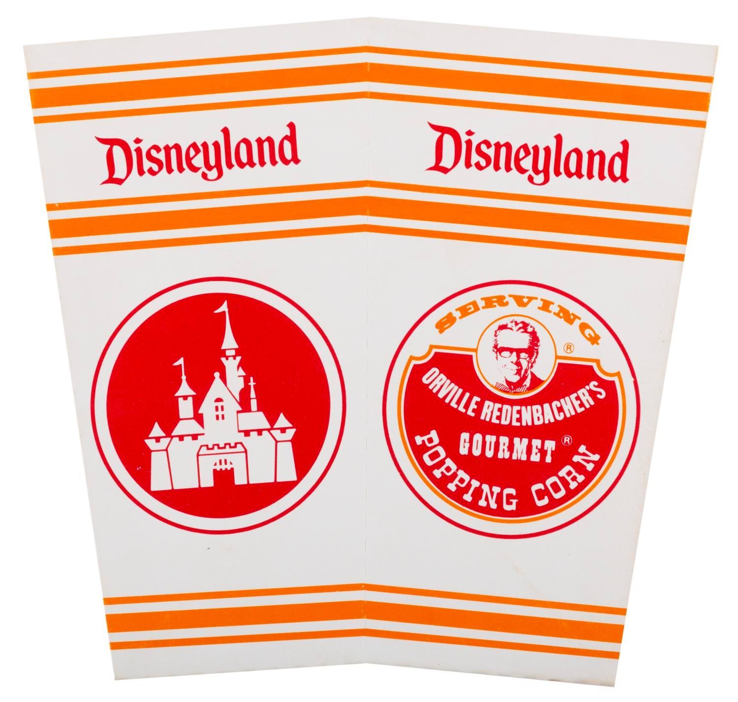 (Disneyland, 1976-80s) A Disneyland popcorn box featuring Sleeping Beauty Castle as well as Orville Redenbacher's Gourmet Popping Corn, the official popcorn of Disneyland from 1977 until 2015. Measuring 6.5" tall, the popcorn box is in fine unused condition.