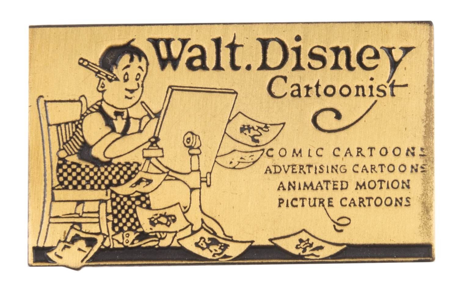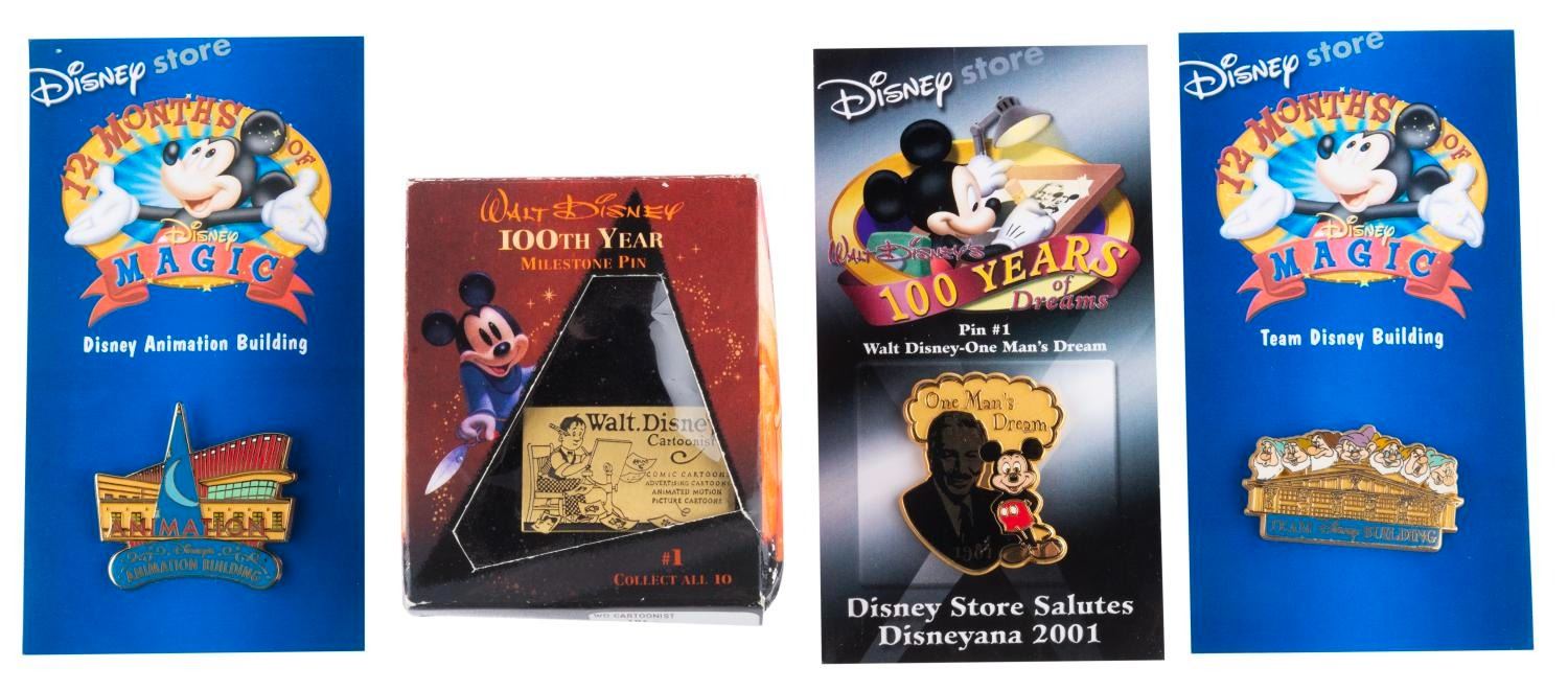 (Disney, 1990s) A collection of four general release pins of the Studio’s history, including Walt’s first Laugh-O-Grams business card, The "One Man’s Dream” television special, The Studio Animation Building, and The Team Disney Building. The pins are in fine condition.